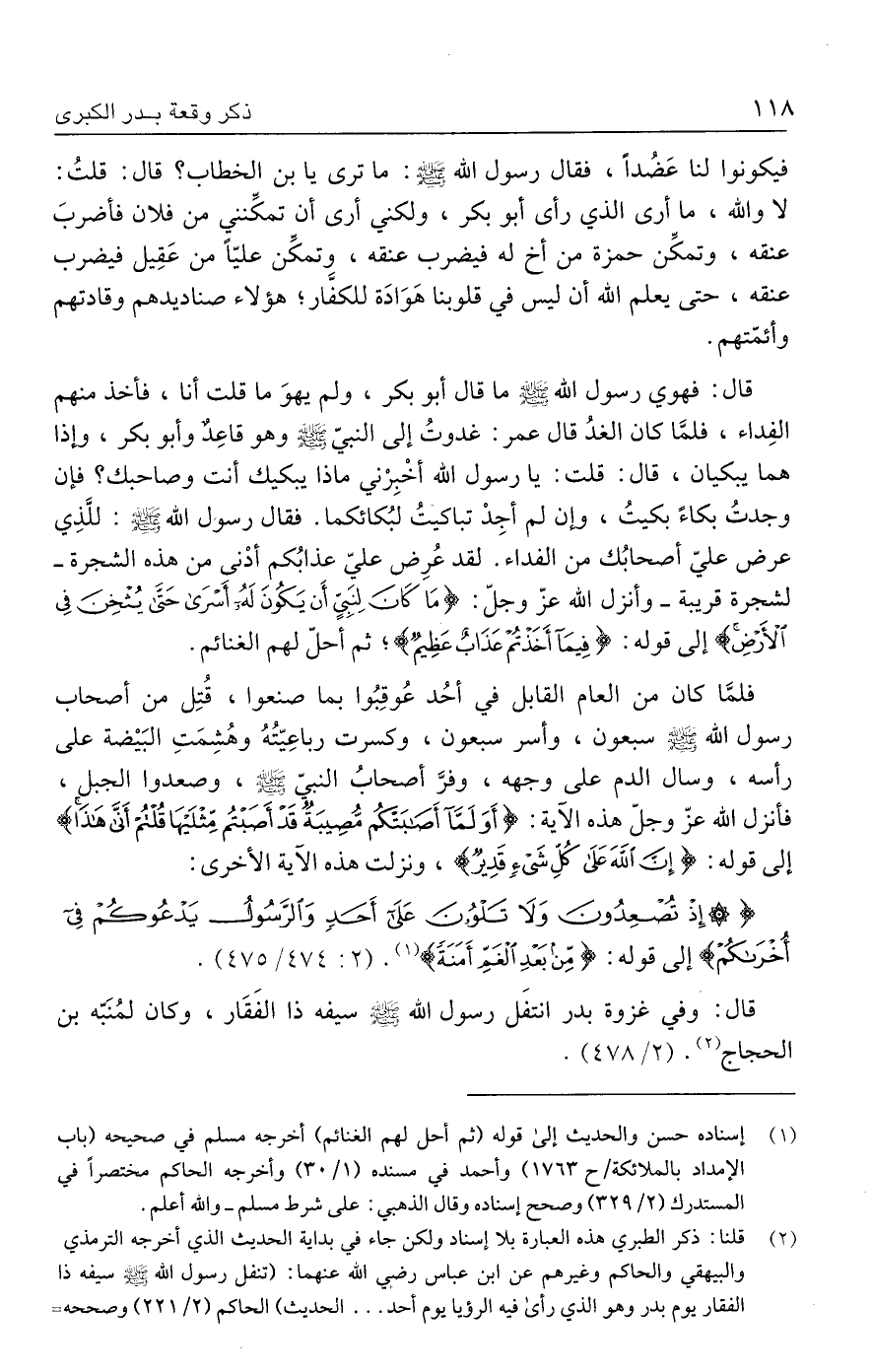 (٢) قلنا: ذكر الطبري هذه العبارة بلا إسناد ولكن جاء في بداية الحديث الذي أخرجه الترمذي والبيهقي والحاكم وغيرهم عن ابن عباس رضي الله عنهما: (تنفل رسول الله - صلى الله عليه وسلم - صلى الله عليه وسلم - سيفه ذا الفقار يوم بدر وهو الذي رأى فيه الرؤيا يوم أحد ... الحديث) الحاكم (٢/ ٢٢١) وصححه =