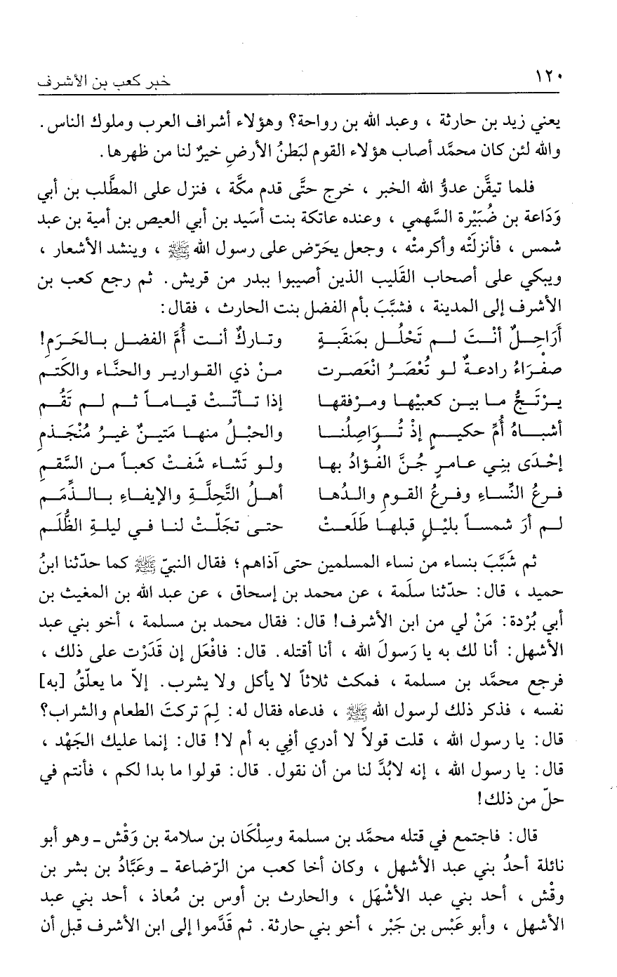 ثم شَبَّبَ بنساء من نساء المسلمين حتى آذاهم؛ فقال النبيّ - صلى الله عليه وسلم - كما حدَّثنا ابنُ حميد، قال: حدَّثنا سلَمة، عن محمد بن إسحاق، عن عبد الله بن المغيث بن أبي بُرْدة: مَنْ لي من ابن الأشرف! قال: فقال محمد بن مسلمة، أخو بني عبد الأشهل: أنا لك به يا رَسولَ الله، أنا أقتله. قال: فافْعَل إن قَدَرْت على ذلك، فرجع محمَّد بن مسلمة، فمكث ثلاثًا لا يأكل ولا يشرب. إلّا ما يعلّقُ [به] نفسه، فذكر ذلك لرسول الله - صلى الله عليه وسلم -، فدعاه فقال له: لِمَ تركتَ الطعام والشراب؟ قال: يا رسول الله، قلت قولًا لا أدري أفِي به أم لا! قال: إنما عليك الجَهْد، قال: يا رسول الله، إنه لابُدَّ لنا من أن نقول. قال: قولوا ما بدا لكم، فأنتم في حلّ من ذلك!