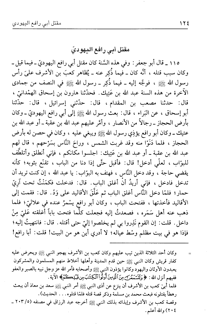 ١١٥ - قال أبو جعفر: وفي هذه السَّنة كان مقتل أبي رافع اليهوديّ - فيما قيل - وكان سبب قتله، أنَّه كان - فيما ذُكِر عنه - يُظاهر كعبَ بن الأشرف على رأس رسول الله - صلى الله عليه وسلم -، فوجَّه إليه - فيما ذُكِر- رسول الله - صلى الله عليه وسلم - في النصف من جمادى الآخرة من هذه السنة عبد الله بن عَتِيك. فحدّثنا هارون بن إسحاق الهمْدانيّ، قال: حدثنا مصعب بن المقدام، قال: حدّثني إسرائيل، قال: حدَّثنا أبو إسحاق، عن البَراء، قال: بعث رسول الله - صلى الله عليه وسلم - إلى أبي رافع اليهوديّ -وكان بأرض الحجاز- رجالًا من الأنصار، وأمَّر عليهم عبد الله بن عقبة -أو عبد الله بن عتيك- وكان أبو رافع يؤذِي رسول الله - صلى الله عليه وسلم - ويبغي عليه، وكان في حصن له بأرض الحجاز، فلما دَنَوْا منه وقد غربت الشمس، وراحَ النَّاس بسَرْحهم، قال لهم عبد الله بن عقبة -أو عبد الله بن عَتِيك: اجلسوا مكانكم، فإني أنطلق وأتلطَّف للبوّاب، لعلّي أدخل! قال: فأقبل حتَّى إذا دنا من الباب، تقنّع بثوبه، كأنه يقضي حاجة، وقد دخل النَّاس، فهتف به البوّاب: يا عبد الله، إن كنت تريد أن تدخل فادخل، فإني أريدُ أن أغلق الباب. قال: فدخلت فكمَنْتُ تحت آرِيّ حمار؛ فلمّا دخل النَّاس أغلق الباب ثم عَلَّقَ الأقاليد على وَدّ. قال: فقمت إلى الأقاليد فأخذتها، ففتحت الباب، وكان أبو رافعِ يسْمرُ عنده في علاليّ؛ فلما ذهب عنه أهل سَمَره، فصعدتُ إليه فجعلت كلَّما فتحت بابا أغلقته عَليّ مِنْ داخل. قلت: إن القوم نَذِروا بي لم يخلصوا إليّ حتى أقتله. قال: فانتهيتُ إليه؛ فإذا هو في بيت مظلم وسْط عياله؛ لا أدري أين هو من البيت! قلت: أبا رافع!
