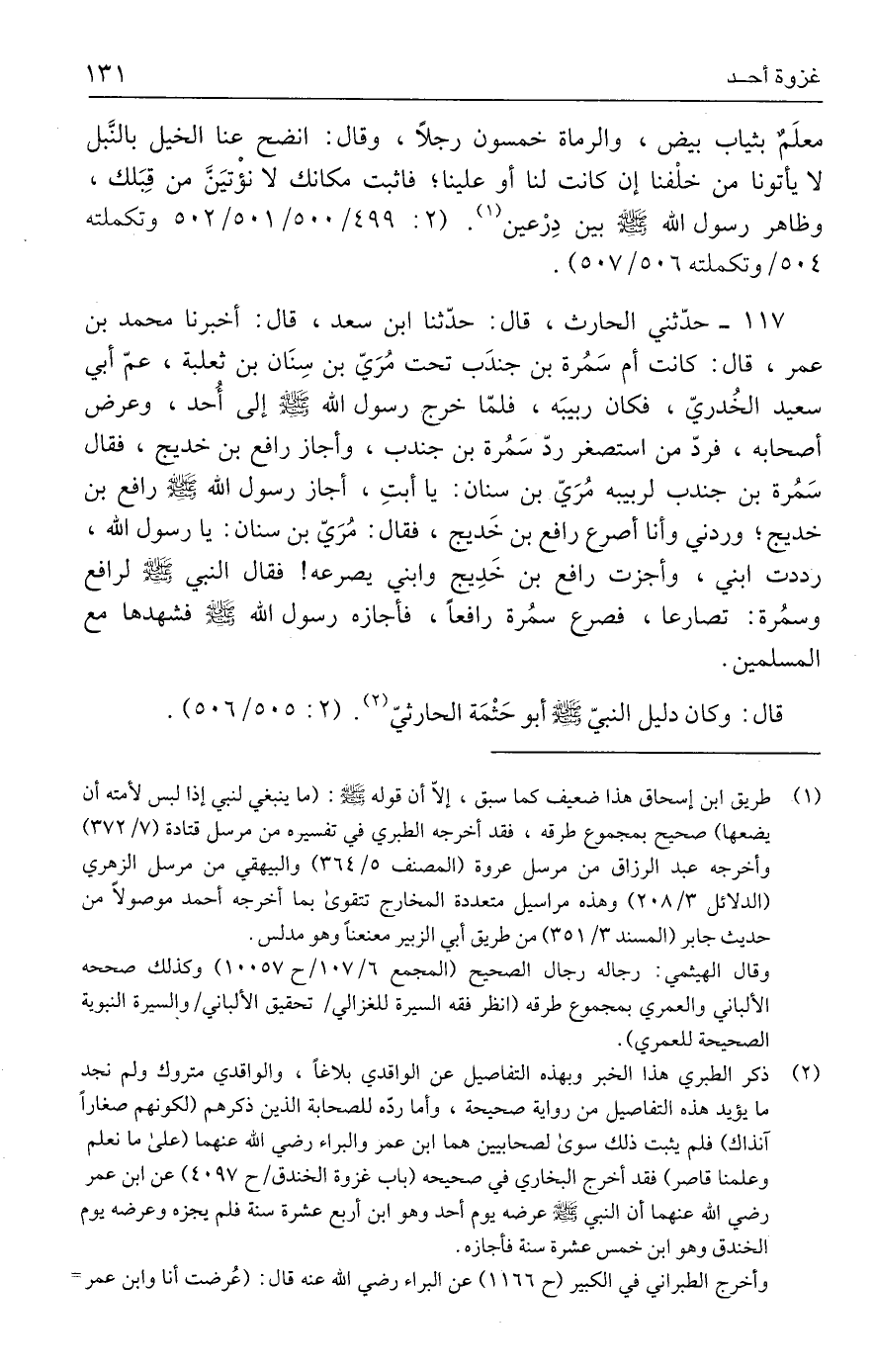 (٢) ذكر الطبري هذا الخبر وبهذه التفاصيل عن الواقدي بلاغًا، والواقدي متروك ولم نجد ما يؤيد هذه التفاصيل من رواية صحيحة، وأما ردّه للصحابة الذين ذكرهم (لكونهم صغارًا آنذاك) فلم يثبت ذلك سوى لصحابيين هما ابن عمر والبراء رضي الله عنهما (على ما نعلم وعلمنا قاصر) فقد أخرج البخاري في صحيحه (باب غزوة الخندق ح ٤٠٩٧) عن ابن عمر رضي الله عنهما أن النبي - صلى الله عليه وسلم - عرضه يوم أحد وهو ابن أربع عشرة سنة فلم يجزه وعرضه يوم الخندق وهو ابن خمس عشرة سنة فأجازه.