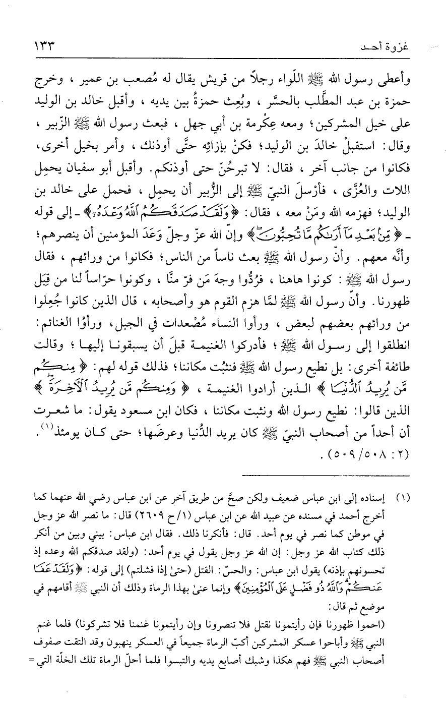 وأعطى رسول الله - صلى الله عليه وسلم - اللّواء رجلًا من قريش يقال له مُصعب بن عمير، وخرج حمزة بن عبد المطَّلب بالحسَّر، وبُعِث حمزةُ بين يديه، وأقبل خالد بن الوليد على خيل المشركين؛ ومعه عِكْرمة بن أبي جهل، فبعث رسول الله - صلى الله عليه وسلم - الزُّبَيْر، وقال: استقبلْ خالدَ بن الوليد؛ فكنْ بإزائِه حتَّى أوذنك، وأمر بخيل أخرى، فكانوا من جانب آخر، فقال: لا تبرحُنّ حتى أوذنكم. وأقبل أبو سفيان يحمِل اللات والعُزَّى، فأرْسلَ النبيّ - صلى الله عليه وسلم - إلى الزُّبير أن يحمِل، فحمل على خالد بن الوليد؛ فهزمه الله ومَنْ معه، فقال: {وَلَقَدْ صَدَقَكُمُ اللَّهُ وَعْدَهُ} - إلى قوله - {مِنْ بَعْدِ مَا أَرَاكُمْ مَا تُحِبُّونَ} وإنّ الله عزّ وجلّ وَعَدَ المؤمنين أن ينصرهم؛ وأنَّه معهم. وأنّ رسول الله - صلى الله عليه وسلم - بعث ناسًا من الناس؛ فكانوا من ورائهم، فقال رسول الله - صلى الله عليه وسلم -: كونوا هاهنا، فرُدُّوا وجهَ مَن فرّ منَّا، وكونوا حرّاسًا لنا من قِبَل ظهورنا. وأنّ رسول الله - صلى الله عليه وسلم - لمَّا هزم القوم هو وأصحابه، قال الذين كانوا جُعِلوا من ورائهم بعضهم لبعض، ورأوا النساء مُصْعدات في الجبل، ورأوُا الغنائم: انطلقوا إلى رسول الله - صلى الله عليه وسلم -، فأدركوا الغنيمة قبلَ أن يسبقونا إليها؛ وقالت طائفة أخرى: بل نطيع رسول الله - صلى الله عليه وسلم - فنثبُت مكاننا؛ فذلك قوله لهم: {مِنْكُمْ مَنْ يُرِيدُ الدُّنْيَا} الذين أرادوا الغنيمة، {وَمِنْكُمْ مَنْ يُرِيدُ الْآخِرَةَ} الذين قالوا: نطيع رسول الله ونثبت مكاننا، فكان ابن مسعود يقول: ما شعرت أن أحدًا من أصحاب النبيّ - صلى الله عليه وسلم - كان يريد الدُّنيا وعرضها؛ حتى كان يومئذ (١). (٢: ٥٠٨/ ٥٠٩).