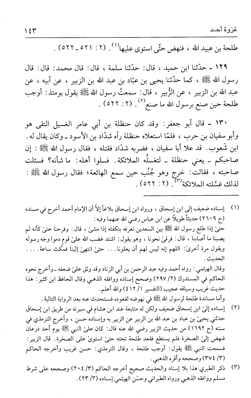 ١٢٩ - حدَّثنا ابن حميد، قال: حدَّثنا سلمة، قال: قال محمد: قال: قال رسول الله - صلى الله عليه وسلم -، كما حدَّثنا يحيى بن عبّاد بن عبد الله بن الزبير، عن أبيه، عن عبد الله بن الزبير، عن الزُّبير، قال: سمعتُ رسول الله - صلى الله عليه وسلم - يقول يومئذ: أوجب طلحة حين صنع برسول الله ما صنع (٢). (٢: ٥٢٢).
