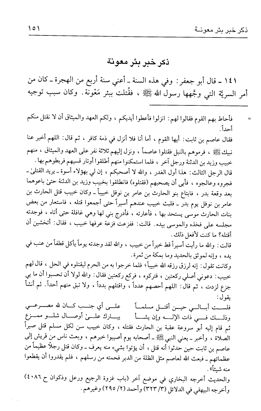 ١٤١ - قال أبو جعفر: وفي هذه السنة -أعني سنة أربع من الهجرة- كان من السريّه التي وجَّهها رسول الله، - صلى الله عليه وسلم - فقُتلت ببئر مَعْونة. وكان سبب توجيه