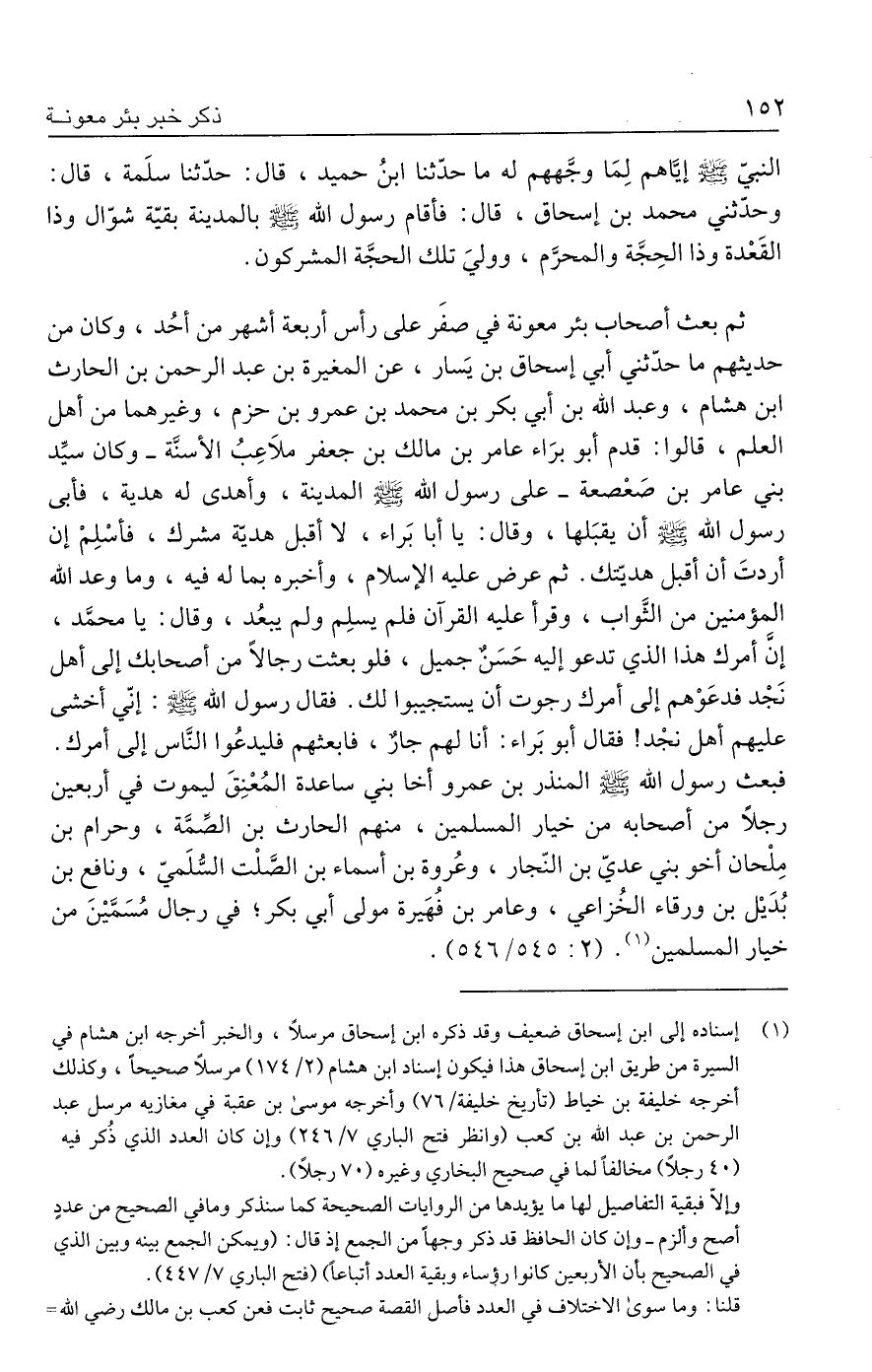 ثم بعث أصحاب بئر معونة في صفَر على رأس أربعة أشهر من أحُد، وكان من حديثهم ما حدّثني أبي إسحاق بن يَسار، عن المغيرة بن عبد الرحمن بن الحارث بن هشام، وعبد الله بن أبي بكر بن محمد بن عمرو بن حزم، وغيرهما من أهل العلم، قالوا: قدم أبو برَاء عامر بن مالك بن جعفر ملَاعِبُ الأسنَّة - وكان سيِّد بني عامر بن صَعْصعة - على رسول الله - صلى الله عليه وسلم - المدينة، وأهدى له هدية، فأبى رسول الله - صلى الله عليه وسلم - أن يقبَلها، وقال: يا أبا بَراء، لا أقبل هديّة مشرك، فأسْلِمْ إن أردتَ أن أقبل هديّتك. ثم عرض عليه الإسلام، وأخبره بما له فيه، وما وعبد الله المؤمنين من الثَّواب، وقرأ عليه القرآن فلم يسلِم ولم يبعُد، وقال: يا محمَّد، إنَّ أمرك هذا الذي تدعو إليه حَسَنٌ جميل، فلو بعثت رجالًا من أصحابك إلى أهل نَجْد فدعَوْهم إلى أمرك رجوت أن يستجيبوا لك. فقال رسول الله - صلى الله عليه وسلم -: إنّي أخشى عليهم أهل نجْد! فقال أبو بَرأء: أنا لهم جارٌ، فابعثهم فليدعُوا النَّاس إلى أمرك. فبعث رسول الله - صلى الله عليه وسلم - المنذر بن عمرو أخا بني ساعدة المُعْنِقَ ليموت في أربعين رجلًا من أصحابه من خيار المسلمين، منهم الحارث بن الصمَّة، وحرام بن مِلْحان أخو بني عديّ بن النّجار، وعُروة بن أسماء بن الصَّلْت السُّلَميّ، ونافع بن بُدَيل بن ورقاء الخُزاعي، وعامر بن فُهَيرة مولى أبي بكر، في رجال مُسَمَّينَ من خيار المسلمين (١). (٢: ٥٤٥/ ٥٤٦).