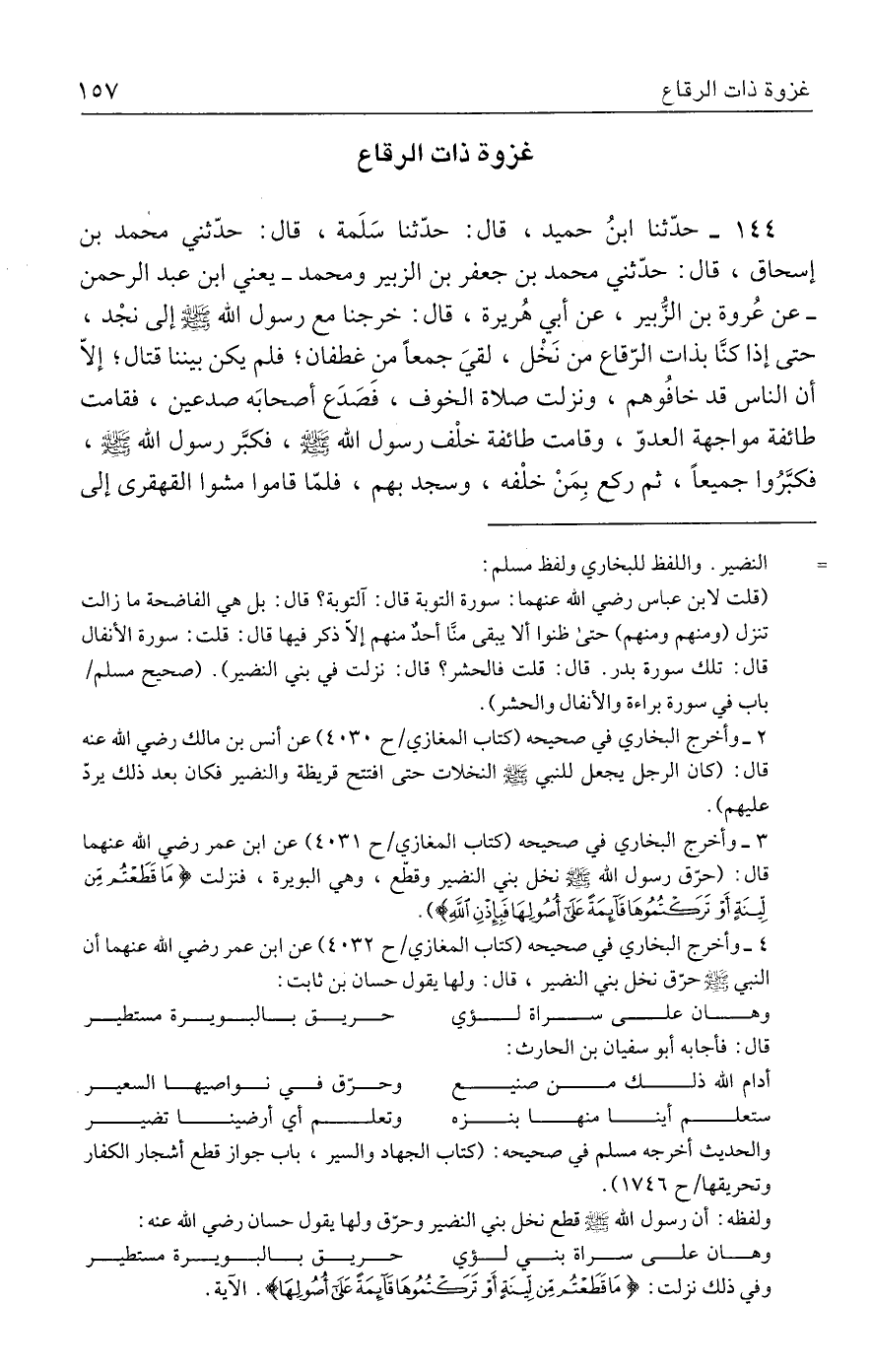 ١٤٤ - حدَّثنا ابنُ حميد، قال: حدَّثنا سَلَمة، قال: حدّثني محمد بن إسحاق، قال: حدّثني محمد بن جعفر بن الزبير ومحمد -يعني ابن عبد الرحمن- عن عُروة بن الزُّبير، عن أبي هُريرة، قال: خرجنا مع رسول الله - صلى الله عليه وسلم - إلى نجْد، حتى إذا كنَّا بذات الرّقاع من نَخْل، لقيَ جمعًا من غطفان؛ فلم يكن بيننا قتال؛ إلَّا أن الناس قد خافُوهم، ونزلت صلاة الخوف، فصَدَع أصحابَه صدعين، فقامت طائفة مواجهة العدوّ، وقامت طائفة خلْف رسول الله - صلى الله عليه وسلم -، فكبَّر رسول الله - صلى الله عليه وسلم -، فكبَّرُوا جميعًا، ثم ركع بِمَنْ خلْفه، وسجد بهم، فلمّا قاموا مشوا القهقرى إلى