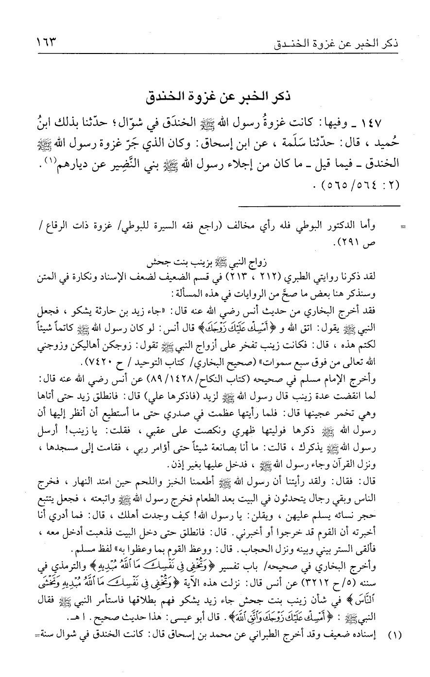 ١٤٧ - وفيها: كانت غزوةُ رسول الله - صلى الله عليه وسلم - الخندَق في شوّال؛ حدَّثنا بذلك ابنُ حُميد، قال: حدَّثنا سَلَمة، عن ابن إسحاق: وكان الذي جَرّ غزوة رسول الله - صلى الله عليه وسلم - الخندق - فيما قيل - ما كان من إجلاء رسول الله - صلى الله عليه وسلم - بني النَّضِير عن ديارهم (١). (٢: ٥٦٤/ ٥٦٥).