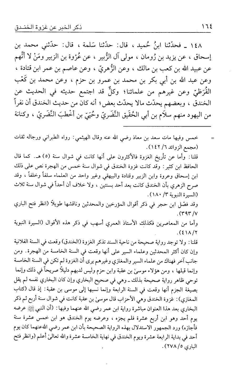 ١٤٨ - فحدّثنا ابنُ حُميد، قال: حدَّثنا سَلمة، قال: حدَّثني محمد بن إسحاق، عن يزيد بن رُومان، مولى آل الزُّبير، عن عُرْوة بن الزبير ومَنْ لا أتَّهم عن عبيد الله بن كعب بن مالك، وعن الزُّهريّ، وعن عاصم بن عمر بن قتادة، وعن عبد الله بن أبي بكر بن محمد بن عمرو بن حزم، وعن محمد بن كَعْب القُرَظيّ وعن غيرهم من علمائنا؛ وكلٌّ قد اجتمع حديثه في الحديث عن الخندق، وبعضهم يحدّث ما لا يحدّث بعض، أنه كان من حديث الخندق أن نفرًا من اليهود منهم سلَام بن أبي الحُقَيق النَضَريّ وحُيَيّ بن أخْطبَ النَّضَريّ، وكنانة
