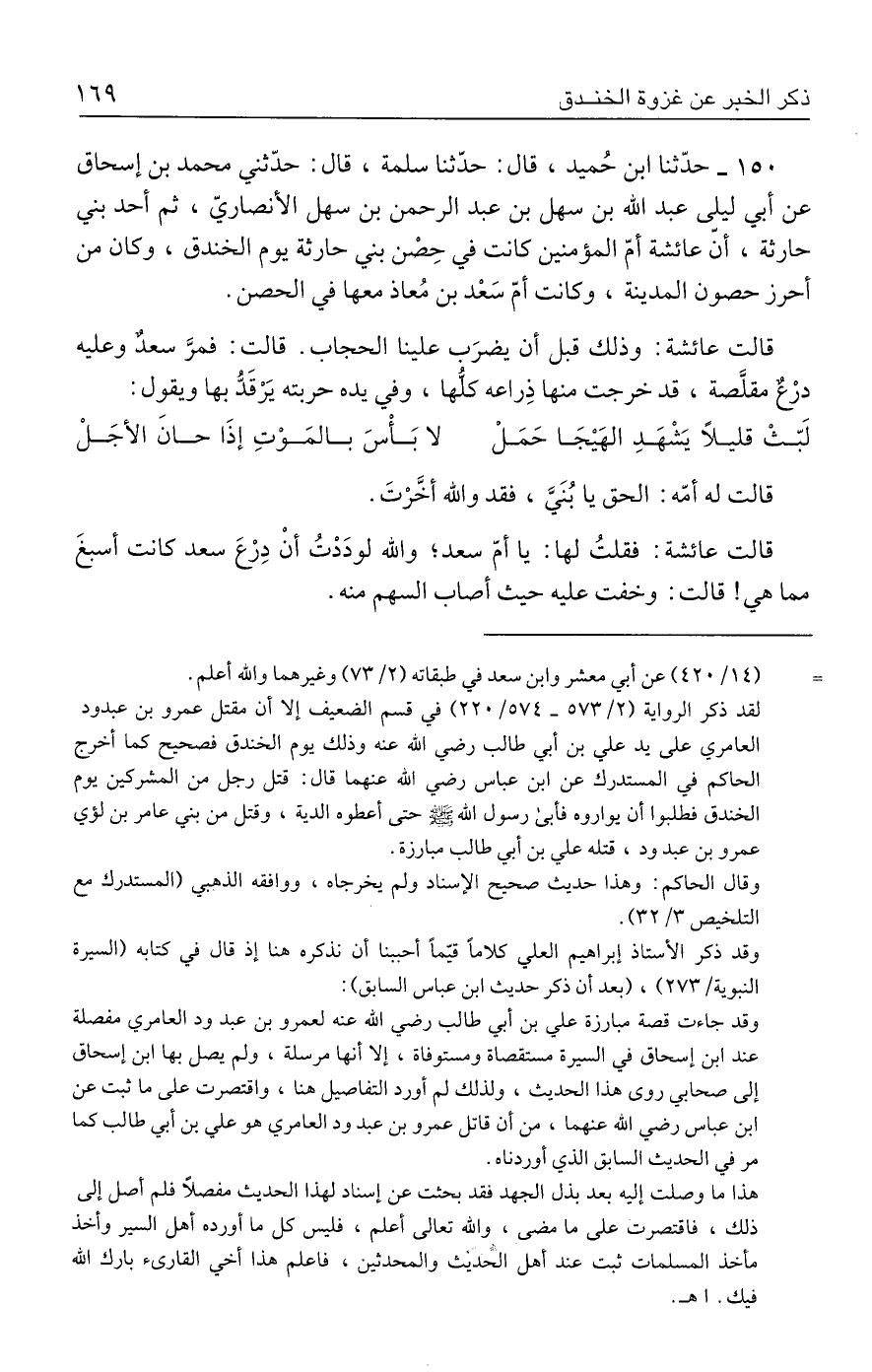 ١٥٠ - حدَّثنا ابن حُميد، قال: حدَّثنا سلمة، قال: حدّثني محمد بن إسحاق عن أبي ليلى عبد الله بن سهل بن عبد الرحمن بن سهل الأنصاريّ، ثم أحد بني حارثة، أنّ عائشة أمّ المؤمنين كانت في حِصْن بني حارثة يوم الخندق، وكان من أحرز حصون المدينة، وكانت أمّ سَعْد بن مُعاذ معها في الحصن.