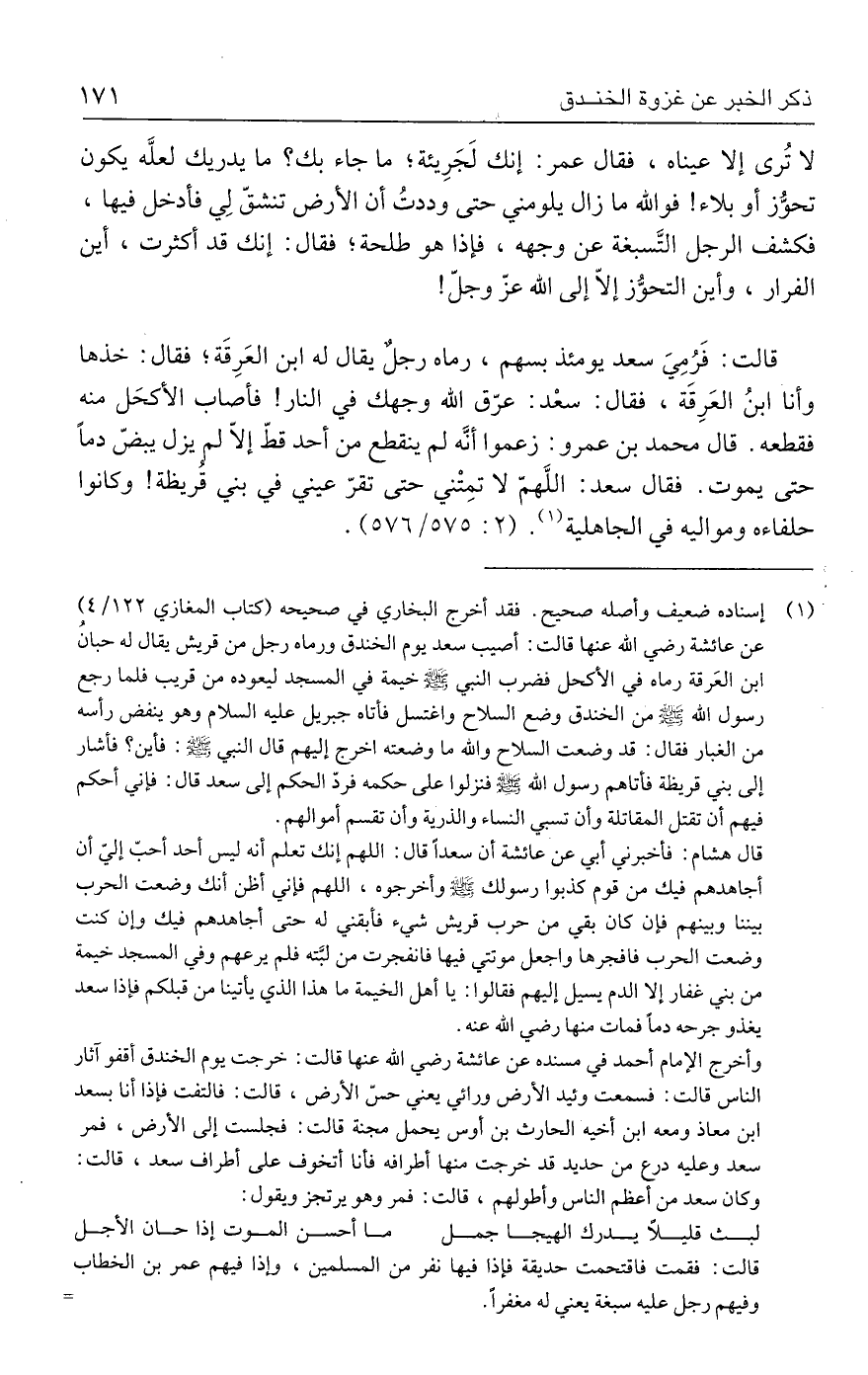 قالت: فَرُمِيَ سعد يومئذ بسهم، رماه رجلٌ يقال له ابن العَرِقَة؛ فقال: خذها وأنا ابنُ العَرِقَة، فقال: سعْد: عرّق الله وجهك في النار؛ فأصاب الأكحَل منه فقطعه. قال محمد بن عمرو: زعموا أنَّه لم ينقطع من أحد قطّ إلَّا لم يزل يبضّ دمًا حتى يموت. فقال سعد: اللَّهمّ لا تمِتْني حتى تقرّ عيني في بني قُريظة! وكانوا حلفاءه ومواليه في الجاهلية (١). (٢: ٥٧٥/ ٥٧٦).