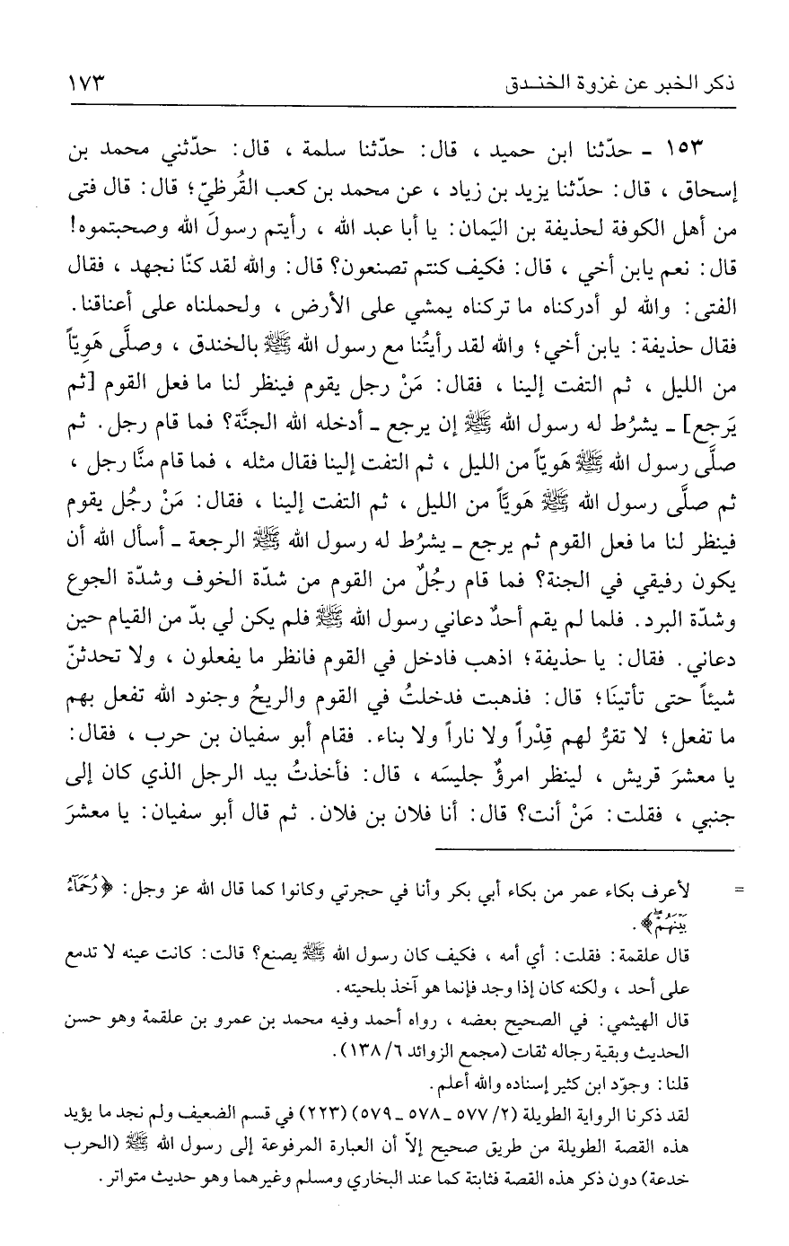 ١٥٣ - حدَّثنا ابن حميد، قال: حدَّثنا سلمة، قال: حدّثني محمد بن إسحاق، قال: حدَّثنا يزيد بن زياد، عن محمد بن كعب القُرظيّ؛ قال: قال فتى من أهل الكوفة لحذيفة بن اليَمان: يا أبا عبد الله، رأيتم رسولَ الله وصحبتموه! قال: نعم يابن أخي، قال: فكيف كنتم تصنعون؟ قال: والله لقد كنّا نجهد، فقال الفتى: والله لو أدركناه ما تركناه يمشي على الأرض، ولحملناه على أعناقنا. فقال حذيفة: يابن أخي؛ والله لقد رأيتُنا مع رسول الله - صلى الله عليه وسلم - بالخندق، وصلَّى هَويًّا من الليل، ثم التفت إلينا، فقال: مَنْ رجل يقوم فينظر لنا ما فعل القوم [ثم يَرجع]- يشرُط له رسول الله - صلى الله عليه وسلم - إن يرجع - أدخله الله الجنَّة؟ فما قام رجل. ثم صلَّى رسول الله - صلى الله عليه وسلم - هَويًّا من الليل، ثم التفت إلينا فقال مثله، فما قام منَّا رجل، ثم صلَّى رسول الله - صلى الله عليه وسلم - هَويًّا من الليل، ثم التفت إلينا، فقال: مَنْ رجُل يقوم فينظر لنا ما فعل القوم ثم يرجع - يشرُط له رسول الله - صلى الله عليه وسلم - الرجعة - أسأل الله أن يكون رفيقي في الجنة؟ فما قام رجُلٌ من القوم من شدّة الخوف وشدّة الجوع وشدّة البرد. فلما لم يقم أحدٌ دعاني رسول الله - صلى الله عليه وسلم - فلم يكن لي بدّ من القيام حين دعاني. فقال: يا حذيفة؟ اذهب فادخل في القوم فانظر ما يفعلون، ولا تحدثنّ شيئًا حتى تأتينَا؛ قال: فذهبت فدخلتُ في القوم والريحُ وجنود الله تفعل بهم ما تفعل؛ لا تمرُّ لهم قِدْرًا ولا نارًا ولا بناء. فقام أبو سفيان بن حرب، فقال: يا معشرَ قريش، لينظر امرؤٌ جليسَه، قال: فأخذتُ بيد الرجل الذي كان إلى جنبي، فقلت: مَنْ أنت؟ قال: أنا فلان بن فلان. ثم قال أبو سفيان: يا معشرَ