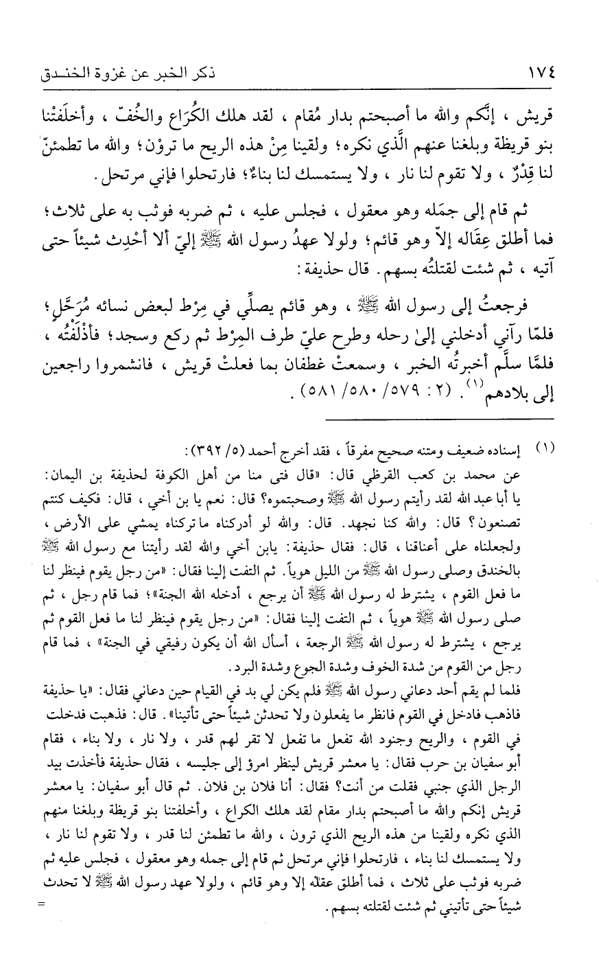 فلما لم يقم أحد دعاني رسول الله - صلى الله عليه وسلم - فلم يكن لي بد في القيام حين دعاني فقال: "يا حذيفة فاذهب فادخل في القوم فانظر ما يفعلون ولا تحدثن شيئًا حتى تأتينا". قال: فذهبت فدخلت في القوم، والريح وجنود الله تفعل ما تفعل لا تقر لهم قدر، ولا نار، ولا بناء، فقام أبو سفيان بن حرب فقال: يا معشر قريش لينظر امرؤ إلى جليسه، فقال حذيفة فأخذت بيد الرجل الذي جنبي فقلت من أنت؟ فقال: أنا فلان بن فلان. ثم قال أبو سفيان: يا معشر قريش إنكم والله ما أصبحتم بدار مقام لقد هلك الكراع، وأخلفتنا بنو قريظة وبلغنا منهم الذي نكره ولقينا من هذه الريح الذي ترون، والله ما تطمئن لنا قدر، ولا تقوم لنا نار، ولا يستمسك لنا بناء، فارتحلوا فإني مرتحل ثم قام إلى جمله وهو معقول، فجلس عليه ثم ضربه فوثب على ثلاث، فما أطلق عقله إلَّا وهو قائم، ولولا عهد رسول الله - صلى الله عليه وسلم - لا تحدث شيئًا حتى تأتيني ثم شئت لقتلته بسهم. =