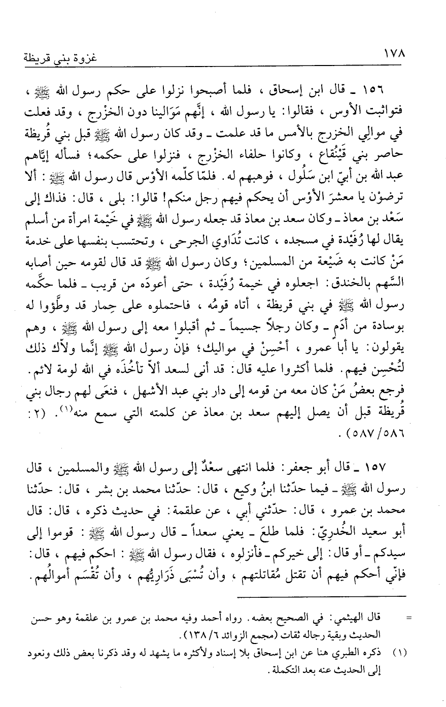 ١٥٧ - قال أبو جعفر: فلما انتهى سعْدٌ إلى رسول الله - صلى الله عليه وسلم - والمسلمين، قال رسول الله - صلى الله عليه وسلم - فيما حدَّثنا ابنُ وكيع، قال: حدَّثنا محمد بن بشر، قال: حدَّثنا محمد بن عمرو، قال: حدّثني أبي، عن علقمة: في حديث ذكره، قال: قال أبو سعيد الخُدرِيّ: فلما طلعَ - يعني سعدًا - قال رسول الله - صلى الله عليه وسلم - قوموا إلى سيدكم -أو قال: إلى خيركم- فأنزلوه، فقال رسول الله - صلى الله عليه وسلم -: احكم فيهم، قال: فإنّي أحكم فيهم أن تقتل مُقاتلتهم، وأن تُسْبَى ذَرَارِيُّهم، وأن تُقْسَم أموالُهم.
