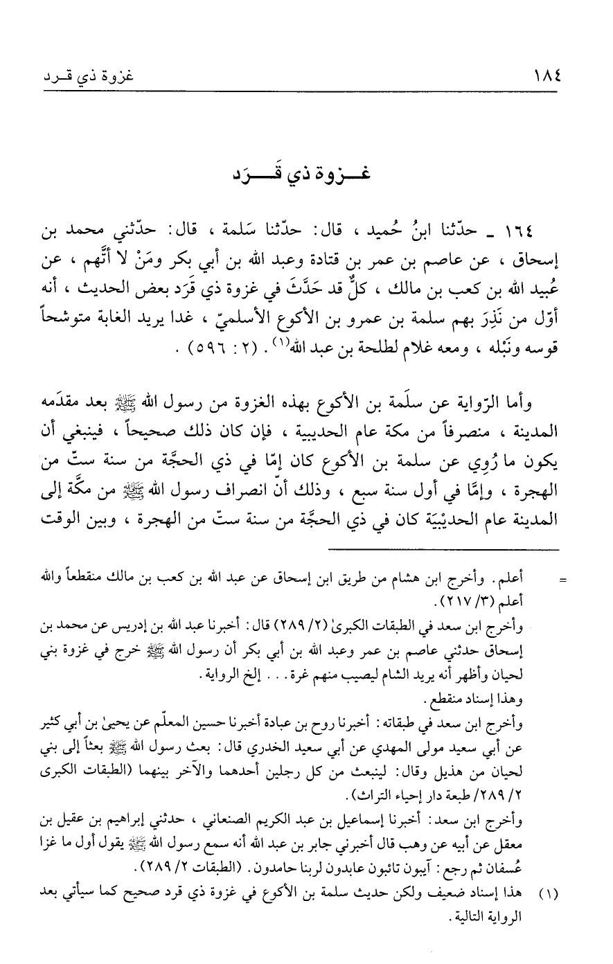 ١٦٤ - حدَّثنا ابنُ حُميد، قال: حدَّثنا سَلمة، قال: حدّثني محمد بن إسحاق، عن عاصم بن عمر بن قتادة وعبد الله بن أبي بكر ومَنْ لا أتَّهم، عن عُبيد الله بن كعب بن مالك، كلٌّ قد حَدَّثَ في غزوة ذي قَرَد بعض الحديث، أنه أوَّل من نَذِرَ بهم سلمة بن عمرو بن الأكوع الأسلميّ، غدا يريد الغابة متوشحًا قوسه ونَبْله، ومعه غلام لطلحة بن عبد الله (١). (٢: ٥٩٦).