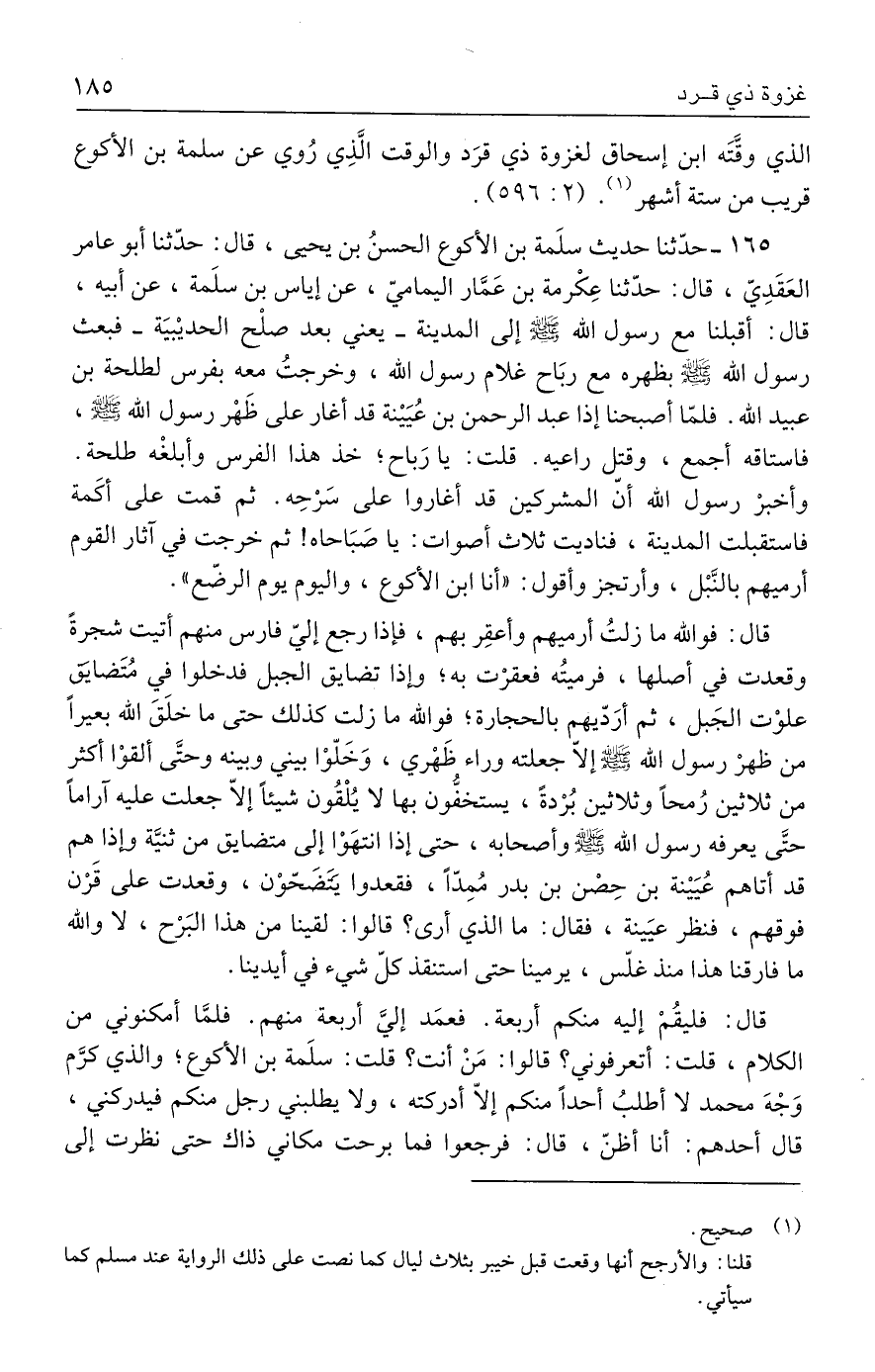 ١٦٥ - حدَّثنا حديث سلَمة بن الأكوع الحسنُ بن يحيى، قال: حدَّثنا أبو عامر العَقَدِيّ، قال: حدَّثنا عِكْرمة بن عَمَّار اليماميّ، عن إياس بن سلَمة، عن أبيه، قال: أقبلنا مع رسول الله - صلى الله عليه وسلم - إلى المدينة -يعني بعد صلْح الحديبيَة- فبعث رسول الله. بظهره مع ربَاح غلام رسول الله - صلى الله عليه وسلم -، وخرجتُ معه بفرس لطلحة بن عبيد الله. فلمّا أصبحنا إذا عبد الرحمن بن عُيَينة قد أغار على ظَهْر رسول الله - صلى الله عليه وسلم -، فاستاقه أجمع، وقتل راعيه. قلت: يا رَباح؛ خذ هذا الفرس وأبلغْه طلحة. وأخبرْ رسول الله - صلى الله عليه وسلم - أنّ المشركين قد أغاروا على سَرْحِه. ثم قمت على أكَمة فاستقبلت المدينة، فناديت ثلاث أصوات: يا صَبَاحاه! ثم خرجت في آثار القوم أرميهم بالنَّبْل، وأرتجز وأقول: "أنا ابن الأكوع، واليوم يوم الرضّع".