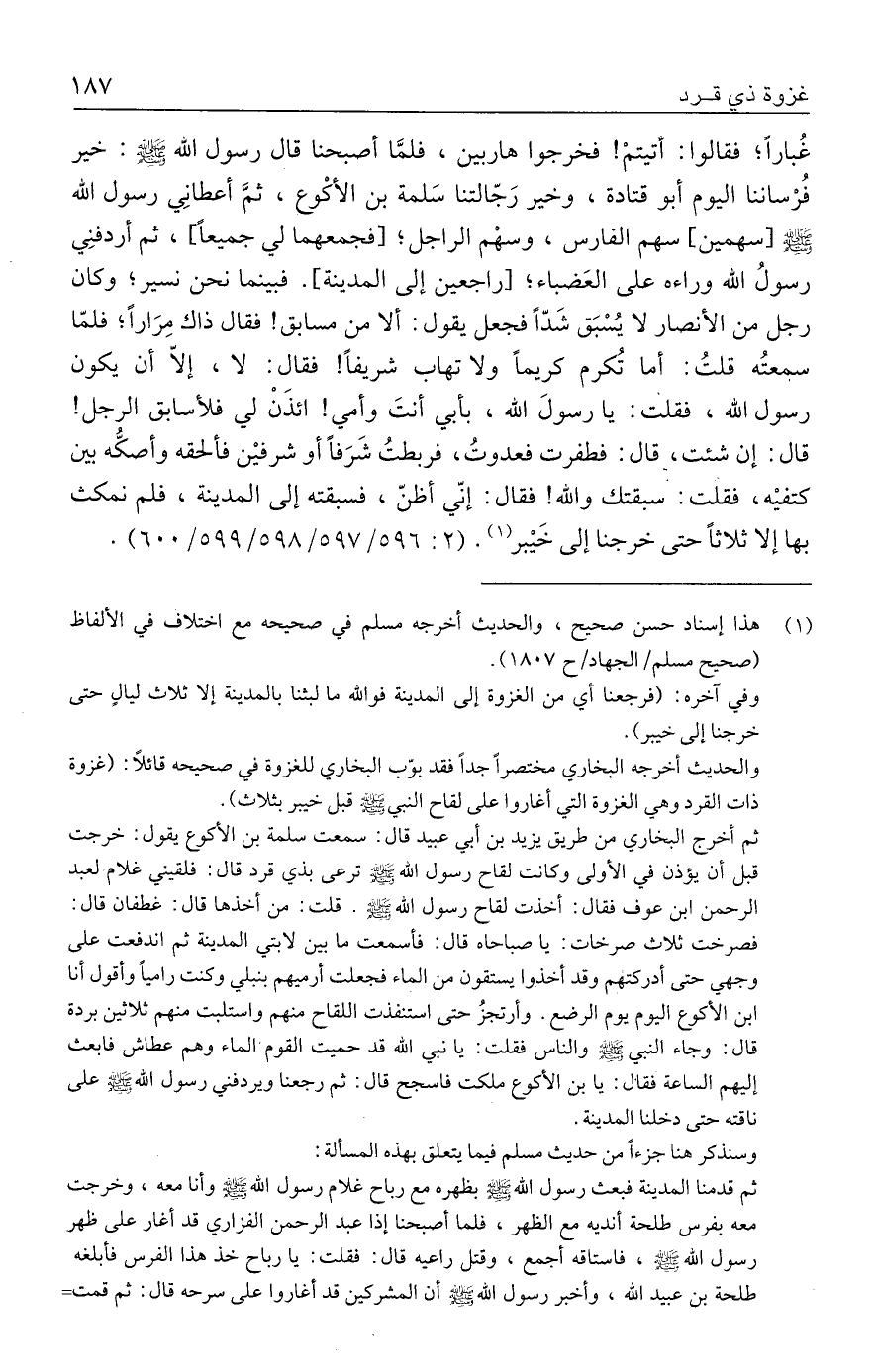 ثم أخرج البخاري من طريق يزيد بن أبي عبيد قال: سمعت سلمة بن الأكوع يقول: خرجت قبل أن يؤذن في الأولى وكانت لقاح رسول الله - صلى الله عليه وسلم - ترعى بذي قرد قال: فلقيني غلام لعبد الرحمن بن عوف فقال: أخذت لقاح رسول الله - صلى الله عليه وسلم -. قلت: من أخذها قال: غطفان قال: فصرخت ثلاث صرخات: يا صباحاه قال: فأسمعت ما بين لابتي المدينة ثم اندفعت على وجهي حتى أدركتهم وقد أخذوا يستقون من الماء فجعلت أرميهم بخبلي وكنت راميًا وأقول أنا ابن الأكوع اليوم يوم الرضع. وأرتجزُ حتى استنفذت اللقاح منهم واستلبت منهم ثلاثين بردة قال: وجاء النبي - صلى الله عليه وسلم - والناس فقلت: يا نبي الله قد حميت القوم الماء وهم عطاش فابعث إليهم الساعة فقأل: يا بن الأكوع ملكت فاسجح قال: ثم رجعنا ويردفني رسول الله - صلى الله عليه وسلم - على ناقته حتى دخلنا المدينة.