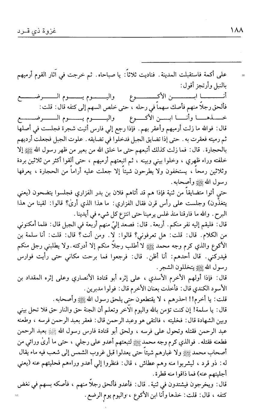 قال: يا سلمة! إن كنت تؤمن بالله واليوم الآخر وتعلم أن الجنة حق والنار حق فلا تحل بيني وبين الشهادة قال: فخليته، فالتقى هو وعبد الرحمن قال: فعقر بعبد الرحمن فرسه، وطعنه عبد الرحمن فقتله وتحول على فرسه، ولحق أبو قتادة فارس رسول الله - صلى الله عليه وسلم - بعبد الرحمن فطعنه فقتله. فوالذي كرم وجه محمد - صلى الله عليه وسلم - لنبعتهم أعدو على رجلي، حتى ما أرى ورائي من أصحاب محمد - صلى الله عليه وسلم - ولا غبارهم شيئًا حتى يعدلوا قبل غروب الشمس إلى شعب فيه ماء يقال له: ذو قرد، ليشربوا منه وهم عطاش، قال: فنظروا إلي أعدو وراءهم فحليتهم عنه (يعني أجليتهم عنه) فما ذاقوا منه قطرة.