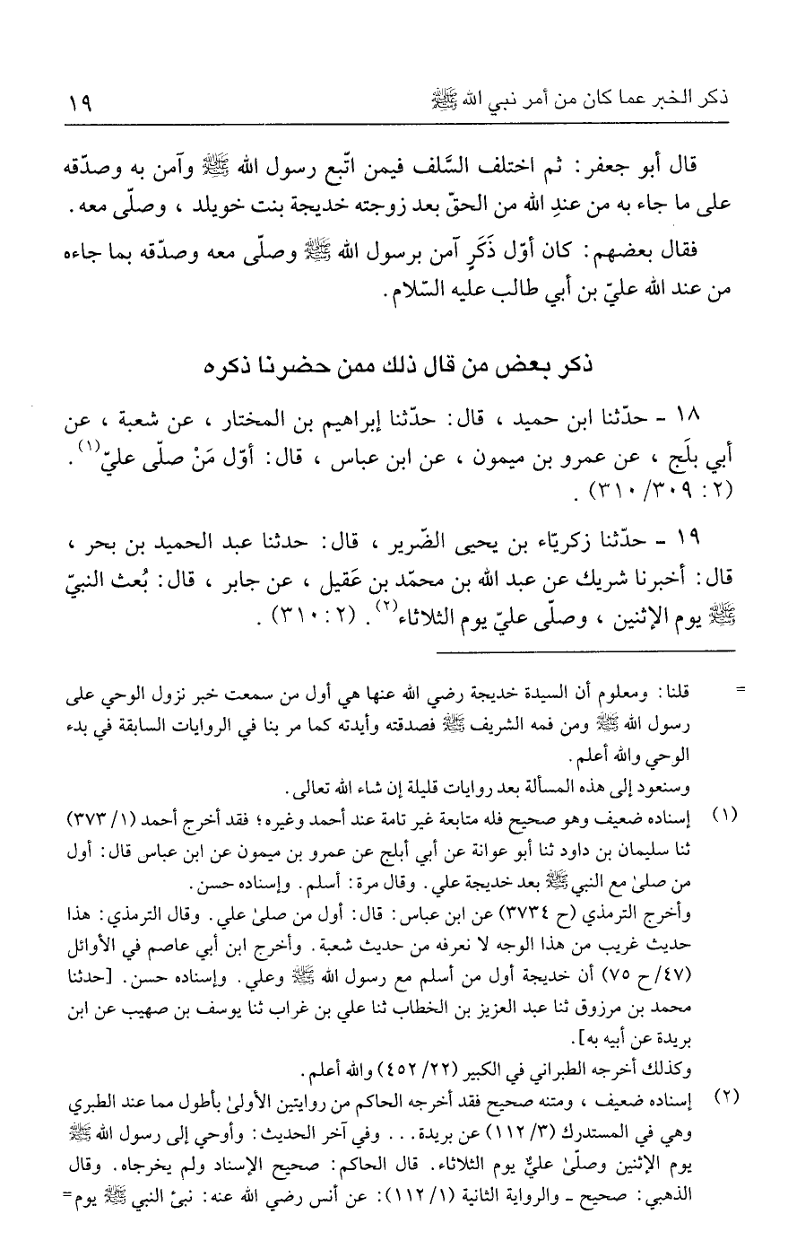 ١٩ - حدَّثنا زكريّاء بن يحيى الضّرير، قال: حدثنا عبد الحميد بن بحر، قال: أخبرنا شريك عن عبد الله بن محمّد بن عَقيل، عن جابر، قال: بُعث النبيّ - صلى الله عليه وسلم - يوم الإثنين، وصلّى عليّ يوم الثلاثاء (٢). (٢: ٣١٠).