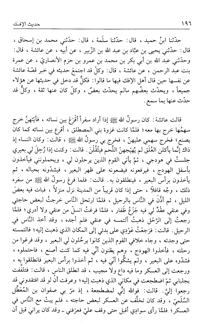 حدَّثنا ابنُ حميد، قال: حدَّثنا سلَمة، قال: حدّثني محمد بن إسحاق، قال: حدّثني يحيى بن عبَّاد بن عبد الله بن الزُّبَيْر، عن أبيه، عن عائشة، قال: وحدّثني عبد الله بن أبي بكر بن محمد بن عمرو بن حزم الأنصاريّ، عن عمرة بنت عبد الرحمن، عن عائشة، قال: وكلّ قد اجتمعَ حديثه في خبر قصّة عائشة عن نفسها حين قال أهل الإفك فيها ما قالوا: فكلٌّ قد دخل في حديثها عن هؤلاء جميعًا، ويحدّث بعضُهم ما لم يحدّث بعضٌ، وكلّ كان عنها ثقة، وكلٌّ قد حدّث عنها بما سمع.