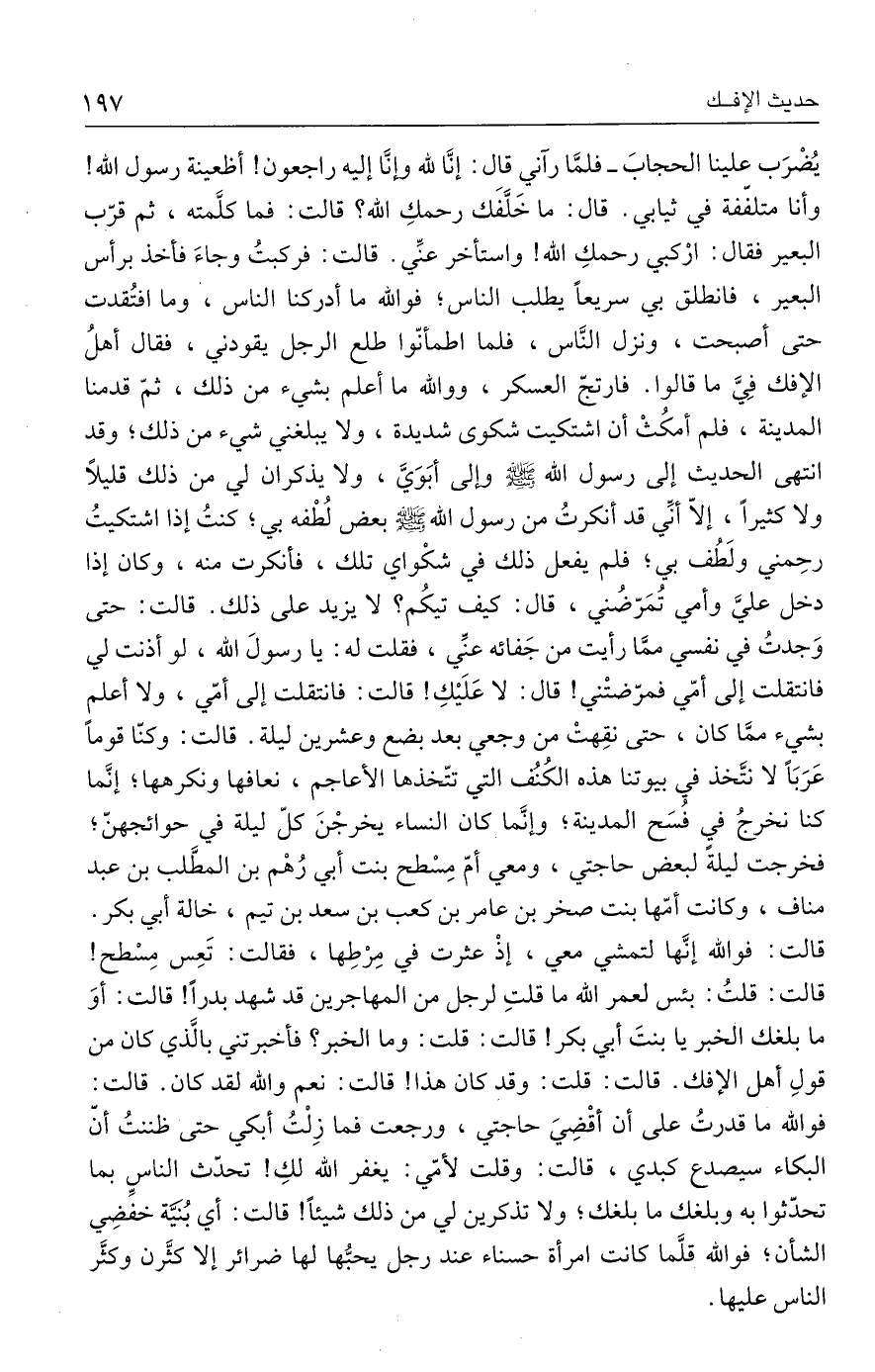 يُضْرَب علينا الحجابَ - فلمَّا رآني قال: إنَّا لله وإنَّا إليه راجعون! أظعينة رسول الله! وأنا متلفّفة في ثيابي. قال: ما خَلَّفَك رحمكِ الله؟ قالت: فما كلَّمته، ثم قرّب البعير فقال: ارْكبي رحمكِ الله" واستأخَّر عنِّي. قالت: فركبتُ وجاءَ فأخذ برأس البعير، فانطلق بي سريعًا يطلب الناس؛ فوالله ما أدركنا الناس، وما افتُقدت حتى أصبحت، ونزل النَّاس، فلما اطمأنّوا طلع الرجل يقودني، فقال أهلُ الإفك فِيَّ ما قالوا. فارتجّ العسكر، ووالله ما أعلم بشيء من ذلك، ثمّ قدمنا المدينة، فلم أمكُثْ أن اشتكيت شكوى شديدة، ولا يبلغني شيء من ذلك؛ وقد انتهى الحديث إلى رسول الله - صلى الله عليه وسلم - وإلى أبَوَيَّ، ولا يذكران لي من ذلك قليلًا ولا كثيرًا، إلَّا أنِّي قد أنكرتُ من رسول الله - صلى الله عليه وسلم - بعض لُطْفه بي؛ كنتُ إذا اشتكيتُ رحِمني ولَطُف بي؛ فلم يفعل ذلك في شكْواي تلك، فأنكرت منه، وكان إذا دخل عليَّ وأمي تُمَرّضُني، قال: كيف تيكُم؟ لا يزيد على ذلك. قالت: حتى وَجدتُ في نفسي ممَّا رأيت من جَفائه عنِّي، فقلت له: يا رسولَ الله، لو أذنت لي فانتقلت إلى أمّي فمرّضتْني! قال: لا عَلَيكِ! قالت: فانتقلت إلى أمّي، ولا أعلم بشيء ممَّا كان، حتى نقِهتْ من وجعي بعد بضع وعشرين ليلة. قالت: وكنّا قومًا عَرَبًا لا نتَّخذ في بيوتنا هذه الكُنُف التي تتّخذها الأعاجم، نعافها ونكرهها؛ إنَّما كنا نخرجُ في فُسَح المدينة؟ وإنَّما كان النساء يخرجْنَ كلّ ليلة في حوائجهنّ؛ فخرجت ليلةً لبعض حاجتي، ومعي أمّ مِسْطح بنت أبي رُهْم بن المطَّلب بن عبد مناف، وكانت أمّها بنت صخر بن عامر بن كعب بن سعد بن تيم، خالة أبي بكر. قالت: فوالله إنَّها لتمشي معي، إذْ عثرت في مِرْطِها، فقالت: تَعِس مِسْطح! قالت: قلتُ: بئس لعمر الله ما قلتِ لرجل من المهاجرين قد شهد بدرًا! قالت: أوَ ما بلغك الخبر يا بنتَ أبي بكر! قالت: قلت: وما الخبر؟ فأخبرتني بالَّذي كان من قولِ أهل الإفك. قالت: قلت: وقد كان هذا! قالت: نعم والله لقد كان. قالت: فوالله ما قدرتُ على أن أقْضِيَ حاجتي، ورجعت فما زِلْتُ أبكي حتى ظننتُ أنّ البكاء سيصدع كبدي، قالت: وقلت لأمّي: يغفر الله لكِ! تحدَّث الناسِ بما تحدّثوا به وبلغك ما بلغك؛ ولا تذكرين لي من ذلك شيئًا! قالت: أي بُنيَّة خفضِي الشأن؛ فوالله قلَّما كانت امرأة حسناء عند رجل يحبُّها لها ضرائر إلَّا كثَّرن وكثَّر الناس عليها.