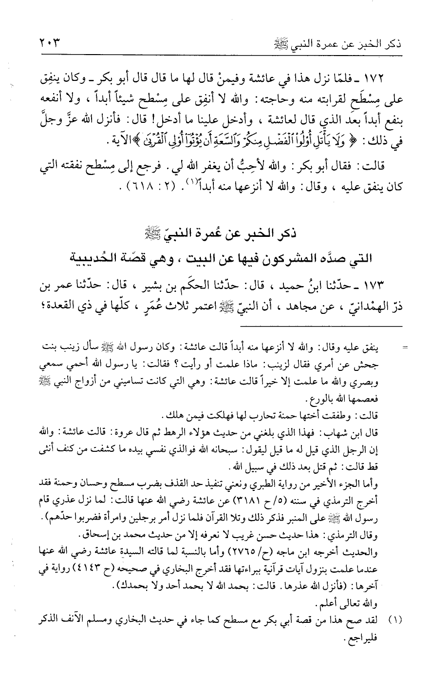 قالت: فقال أبو بكر: والله لأحِبُّ أن يغفر الله لي. فرجع إلى مِسْطح نفقته التي كان ينفق عليه، وقال: والله لا أنزعها منه أبدًا (١). (٢: ٦١٨).