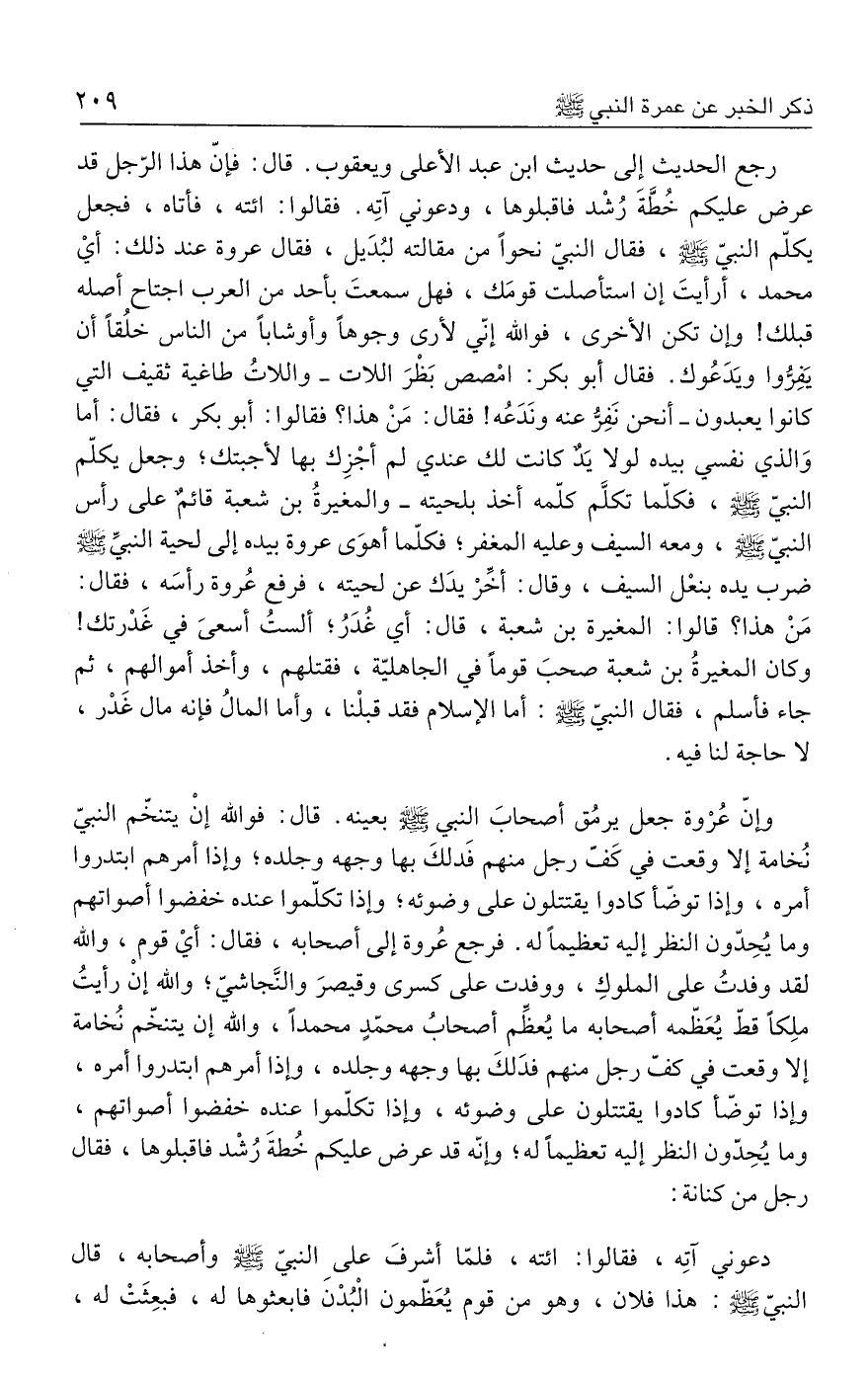 رجع الحديث إلى حديث ابن عبد الأعلى ويعقوب. قال: فإنّ هذا الرّجل قد عرض عليكم خُطَّةَ رُشْد فاقبلوها، ودعوني آتِه. فقالوا: ائته، فأتاه، فجعل يكلّم النبيّ - صلى الله عليه وسلم -، فقال النبيّ نحوًا من مقالته لبُدَيل، فقال عروة عند ذلك: أي محمَّد، أرأيتَ إن استأصلت قومَك، فهل سمعتَ بأحد من العرب اجتاح أصله قبلك! وإن تكن الأخرى، فوالله إنّي لأرى وجوهًا وأوشابًا من الناس خلُقًا أن يَفِرُّوا ويَدَعُوك. فقال أبو بكر: امْصص بَظْرَ اللات - واللاتُ طاغية ثقيف التي كانوا يعبدون - أنحن نَفِرُّ عنه ونَدَعُه! فقال: مَنْ هذا؟ فقالوا: أبو بكر، فقال: أما وَالذي نفسي بيده لولا يَدٌ كانت لك عندي لم أجْزِك بها لأجبتك؛ وجعل يكلّم النبيّ - صلى الله عليه وسلم -، فكلّما تكلَّم كلّمه أخذ بلحيته - والمغيرةُ بن شعبة قائمٌ على رأس النبيّ - صلى الله عليه وسلم -، ومعه السيف وعليه المغفر؛ فكلّما أهوَى عروة بيده إلى لحية النبيِّ - صلى الله عليه وسلم - ضرب يده بنعْل السيف، وقال: أخِّرْ يدَك عن لحيته، فرفع عُروة رأسَه، فقال: مَنْ هذا؟ قالوا: المغيرة بن شعبة، قال: أي غُدَرُ؛ ألستُ أسعى في غَدْرتك! وكان المغيرةُ بن شعبة صحبَ قومًا في الجاهليّة، فقتلهم، وأخذ أموالهم، ثمَّ جاء فأسلم، فقال النبيّ - صلى الله عليه وسلم -: أما الإِسلام فقد قبلْنا، وأما المالُ فإنَّه مال غَدْر، لا حاجة لنا فيه.