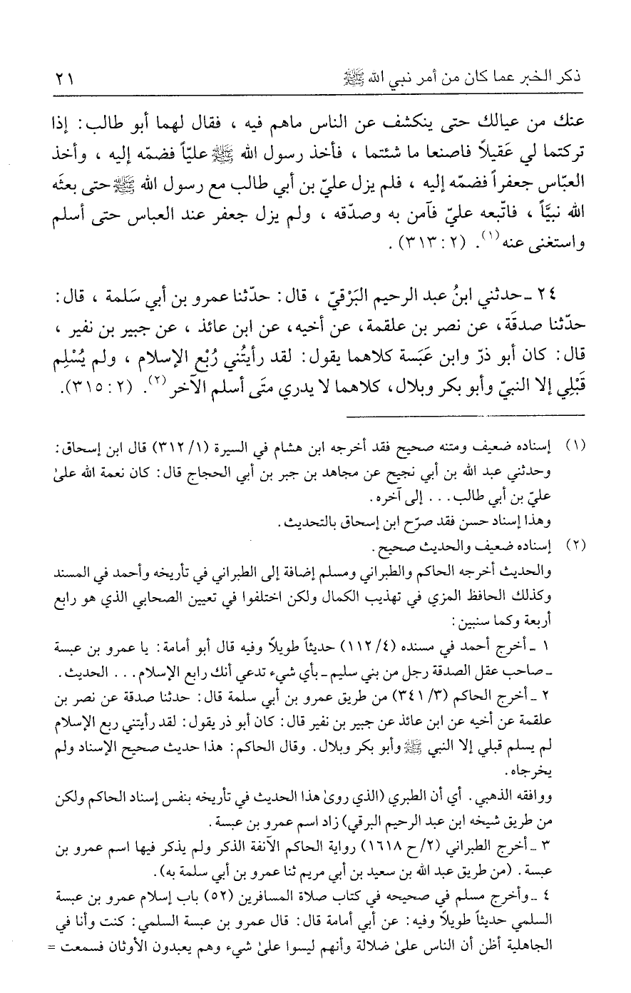٢٤ - حدثني ابنُ عبد الرحيم البَرْقيّ، قال: حدَّثنا عمرو بن أبي سَلمة، قال: حدَّثنا صدقَة، عن نصر بن علقمة، عن أخيه، عن ابن عائذ، عن جبير بن نفير، قال: كان أبو ذرّ وابن عَبَسة كلاهما يقول: لقد رأيتُني رُبْع الإسلام، ولم يُسْلِم قَبْلِي إلا النبيّ وأبو بكر وبلال، كلاهما لا يدري متَى أسلم الآخر (٢). (٢: ٣١٥).