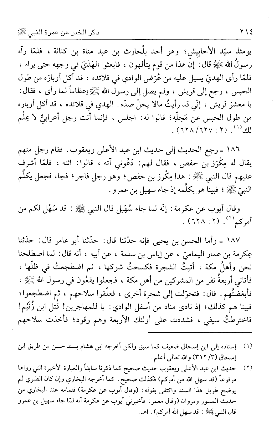 (٢) حديث ابن عبد الأعلى ويعقوب حديث صحيح كما ذكرنا سابقًا والعبارة الأخيرة التي رواها مرفوعًا (قد سهل الله من أمركم) فكذلك صحيح. كما أخرجه البخاري وإن كان الطبري لم يوضح طريق هذا السند واكتفى بقوله: (وقال أيوب عن عكرمة) فتمامه عند البخاري من حديث المسور ومروان (وقال معمر: فأخبرني أيوب عن عكرمة أنَّه لمّا جاء سهيل بن عمرو قال النبي - صلى الله عليه وسلم -: قد سهل الله أمركم). أهـ.
