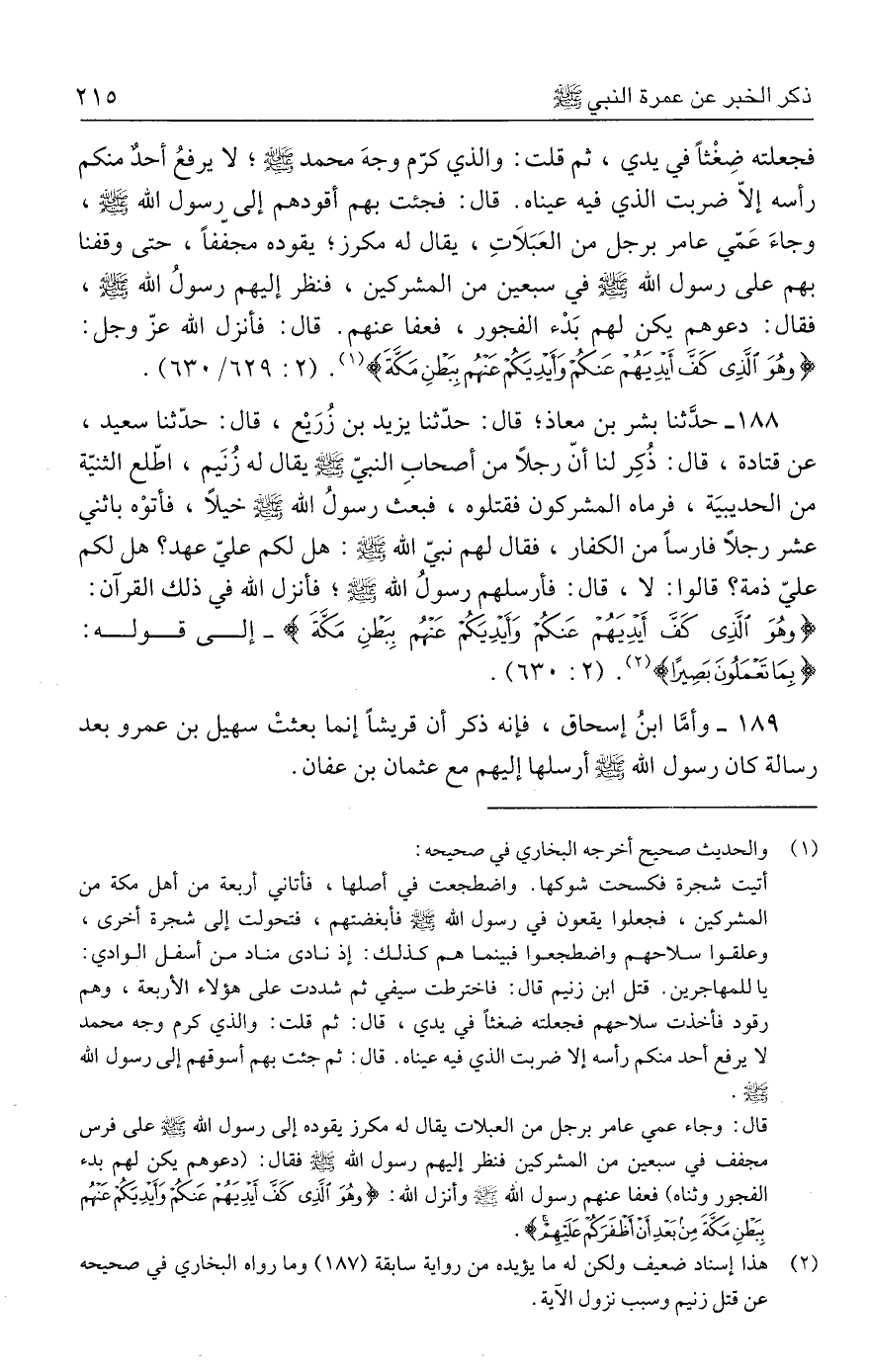 ١٨٨ - حدَّثنا بشر بن معاذ؛ قال: حدَّثنا يزيد بن زُرَيع، قال: حدَّثنا سعيد، عن قتادة، قال: ذُكِر لنا أنّ رجلًا مَن أصحابِ النبيّ - صلى الله عليه وسلم - يقال له زُنَيم، اطّلع الثنيّة من الحديبيَة، فرماه المشركون فقتلوه، فبعث رسولُ الله - صلى الله عليه وسلم - خيلًا، فأتوْه باثني عشر رجلًا فارسًا من الكفار، فقال لهم نبيّ الله - صلى الله عليه وسلم -: هل لكم عليّ عهد؟ هل لكم عليّ ذمة؟ قالوا: لا، قال: فأرسلهم رسولُ الله - صلى الله عليه وسلم -؛ فأنزل الله في ذلك القرآن: {وَهُوَ الَّذِي كَفَّ أَيدِيَهُمْ عَنْكُمْ وَأَيدِيَكُمْ عَنْهُمْ بِبَطْنِ مَكَّةَ} - إلى قوله: {بِمَا تَعْمَلُونَ بَصِيرًا} (٢). (٢: ٦٣٠).