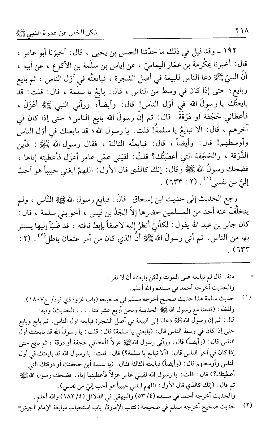 ١٩٢ - وقد قيل في ذلك ما حدَّثنا الحسن بن يحيى، قال: أخبرَنا أبو عامر، قال: أخبرنا عِكْرمة بن عمّار اليماميّ، عن إياس بن سلَمة بن الأكوع، عن أبيه، أنّ النبيّ - صلى الله عليه وسلم - دعا الناس للبيعة في أصل الشجرة، فبايعتُه في أوّل الناس، ثمَّ بايع وبايع؛ حتى إذا كان في وسط من الناس، قال: بايعْ يا سلَمة، قال: قلت: قد بايعتُك يا رسِولَ الله في أوّل الناس! قال: وأيضًا؛ ورآني النبي - صلى الله عليه وسلم - أعْزَلَ، فأعطاني حَجَفة أو دَرَقَةً. قال: ثمَّ إنَّ رسولَ الله بايع الناس؛ حتى إذا كان في آخرهم، قال: ألا تبايعُ يا سلمةُ! قلت: يا رسول الله؛ قد بايعتك في أوّل الناس وأوسطهم! قال: وأيضًا، قال: فبايعتُه الثالثة، فقال رسول الله - صلى الله عليه وسلم -: فأين الدَّرَقة، والحَجَفة التي أعطيتُك؟ قلتُ: لقيَني عمّي عامر أعزَل فأعطيته إياها، فضحك رسولُ الله - صلى الله عليه وسلم - وقال: إنك كالذي قال الأوّل: اللهمّ ابغني حبيبًا هو أحبّ إليَّ من نفسي (١). (٢: ٦٣٣).