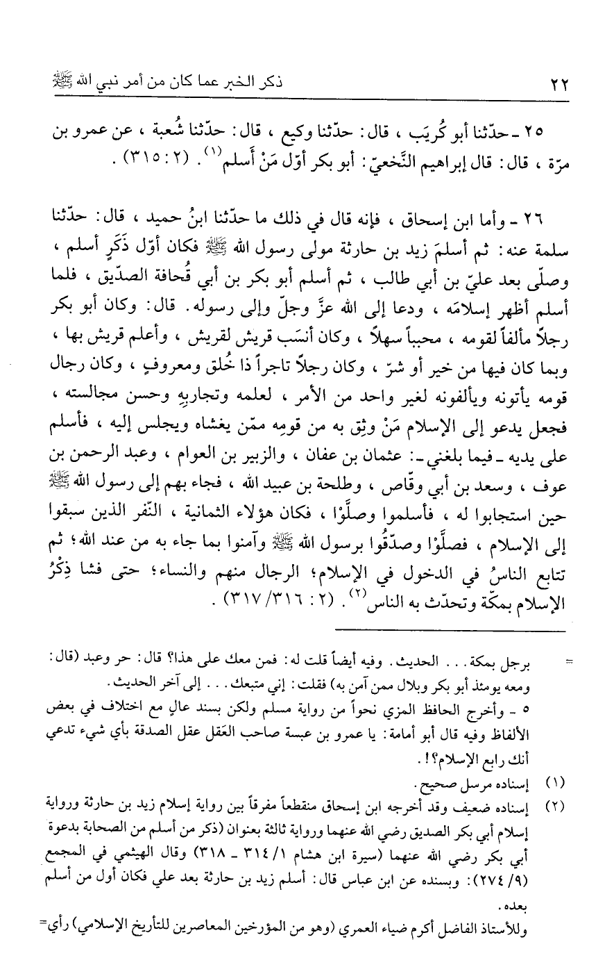 ٢٥ - حدَّثنا أبو كُريَب، قال: حدَّثنا وكيع، قال: حدَّثنا شُعبة، عن عمرو بن مرّة، قال: قال إبراهيم النَّخعيّ: أبو بكر أوّل مَنْ أَسلم (١). (٢: ٣١٥).