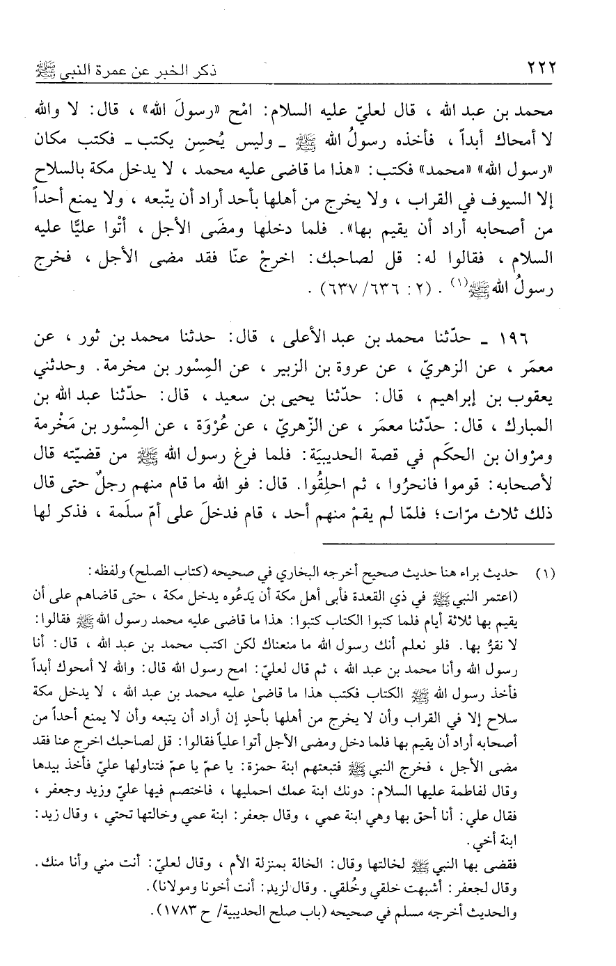 (١) حديث براء هنا حديث صحيح أخرجه البخاري في صحيحه (كتاب الصلح) ولفظه: (اعتمر النبي - صلى الله عليه وسلم - في ذي القعدة فأبى أهل مكة أن يَدعُوه يدخل مكة، حتى قاضاهم على أن يقيم بها ثلاثة أيام فلما كتبوا الكتاب كتبوا: هذا ما قاضى عليه محمَّد رسول الله - صلى الله عليه وسلم - فقالوا: لا نقرُّ بها. فلو نعلم أنك رسول الله ما منعناك لكن اكتب محمَّد بن عبد الله، قال: أنا رسول الله وأنا محمَّد بن عبد الله، ثمَّ قال لعليّ: امح رسول الله قال: والله لا أمحوك أبدًا فأخذ رسول الله - صلى الله عليه وسلم - الكتاب فكتب هذا ما قاضى عليه محمَّد بن عبد الله، لا يدخل مكة سلاح إلا في القراب وأن لا يخرج من أهلها بأحدٍ إن أراد أن يتبعه وأن لا يمنع أحدًا من أصحابه أراد أن يقيم بها فلما دخل ومضى الأجل أتوا عليًّا فقالوا: قل لصاحبك أخرج عنا فقد مضى الأجل، فخرج النبي - صلى الله عليه وسلم - فتبعتهم ابنة حمزة: يا عمّ يا عمّ فتناولها عليّ فأخذ بيدها وقال لفاطمة عليها السلام: دونك ابنة عمك احمليها، فاختصم فيها عليّ وزيد وجعفر، فقال علي: أنا أحق بها وهي ابنة عمي، وقال جعفر: ابنة عمي وخالتها تحتي، وقال زيد: ابنة أخي.