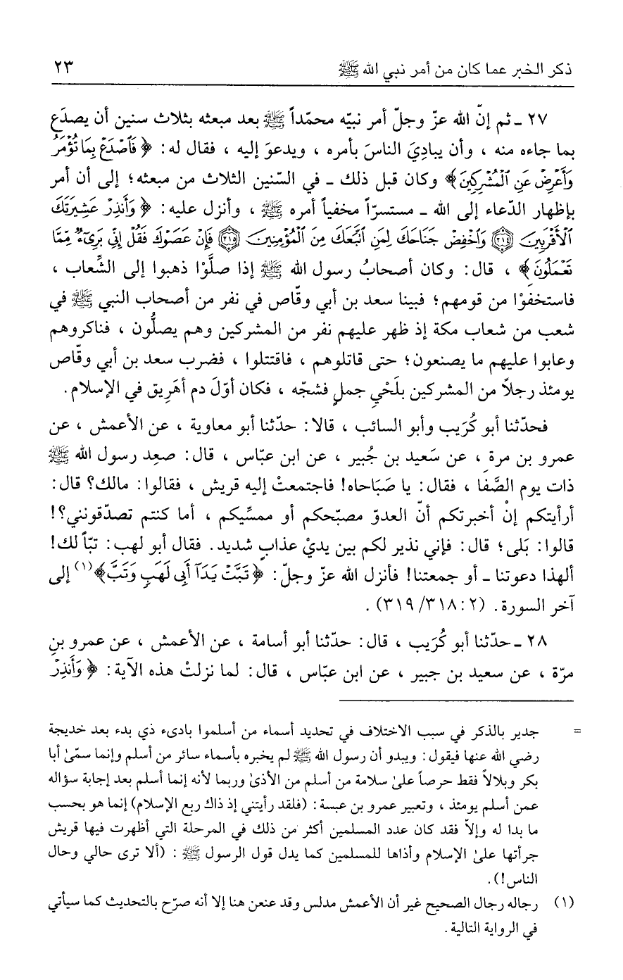 ٢٨ - حدَّثنا أبو كُرَيب، قال: حدَّثنا أبو أسامة، عن الأعمش، عن عمرو بن مرّة، عن سعيد بن جبير، عن ابن عبّاس، قال: لما نزلتْ هذه الآية: {وَأَنْذِرْ