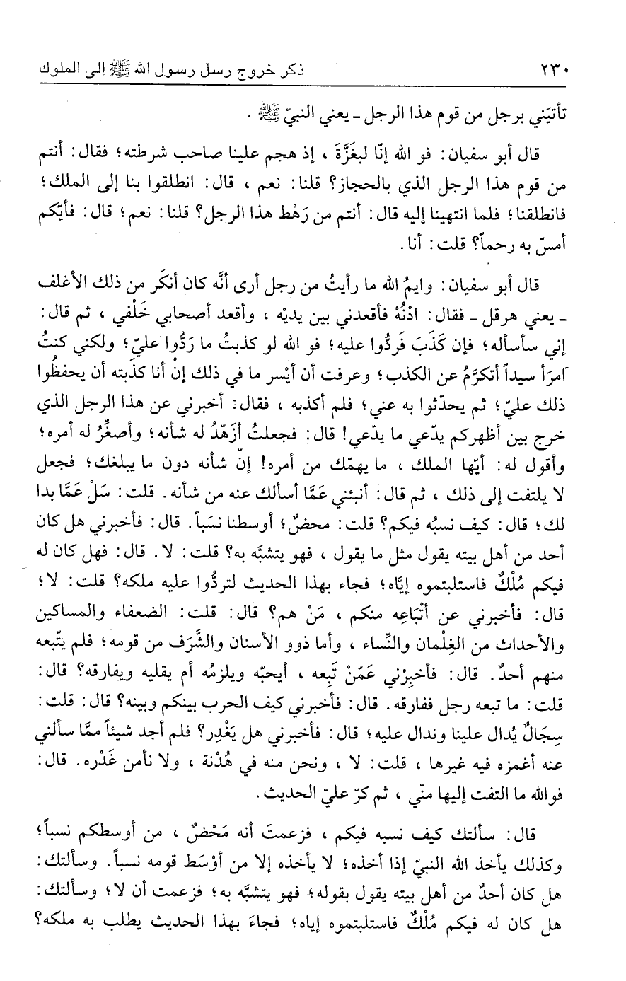 قال أبو سفيان: وايمُ الله ما رأيتُ من رجل أرى أنَّه كان أنكَر من ذلك الأغلف -يعني هرقل- فقال: ادْنُهْ فأقعدني بين يديه، وأقعد أصحابي خَلْفي، ثمَّ قال: إني سأسأله؛ فإن كَذَبَ فَردُّوا عليه؛ فوالله لو كذبتُ ما رَدُّوا عليَّ؛ ولكني كنتُ امرَأ سيدًا أتكرَّمُ عن الكذب؛ وعرفت أن أيسر ما في ذلك إنْ أنا كذبته أن يحفظُوا ذلك عليّ؛ ثمَّ يحدّثوا به عني؛ فلم أكذبه، فقال؛ أخبرني عن هذا الرجل الذي خرج بين أظهركم يدّعي ما يدّعي! قال: فجعلتُ أزَهّدُ له شأنه؛ وأصغِّرُ له أمره؛ وأقول له: أيّها الملك، ما يهمّك من أمره! إنَّ شأنه دون ما يبلغك؛ فجعل لا يلتفت إلى ذلك، ثمَّ قال: أنبئني عَمَّا أسألك عنه من شأنه. قلت: سَلْ عَمَّا بدا لك؛ قال: كيف نسبُه فيكم؟ قلت: محضٌ؛ أوسطنا نسَبًا. قال: فأخبرني هل كان أحد من أهل بيته يقول مثل ما يقول، فهو يتشبَّه به؟ قلت: لا. قال: فهل كان له فيكم مُلْكٌ فاستلبتموه إيّاه؛ فجاء بهذا الحديث لتردُّوا عليه ملكه؟ قلت: لا؛ قال: فأخبرني عن أتْبَاعِه منكم، مَنْ هم؟ قال: قلت: الضعفاء والمساكين والأحداث من الغِلْمان والنِّساء، وأما ذوو الأسنان والشَّرَف من قومه؛ فلم يتّبعه منهم أحدٌ. قال: فأخبِرْني عَمّنْ تَبِعه، أيحبّه ويلزمُه أم يقليه ويفارقه؟ قال: قلت: ما تبعه رجل ففارقه. قال: فأخبرني كيف الحرب بينكم وبينه؟ قال: قلت: سِجَالٌ يُدال علينا وندال عليه؛ قال: فأخبرني هل يَغْدِر؟ فلم أجد شيئًا ممَّا سألني عنه أغمزه فيه غيرها، قلت: لا، ونحن منه في هُدْنة، ولا نأمن غَدْره. قال: فوالله ما التفت إليها منّي، ثمَّ كرّ عليّ الحديث.