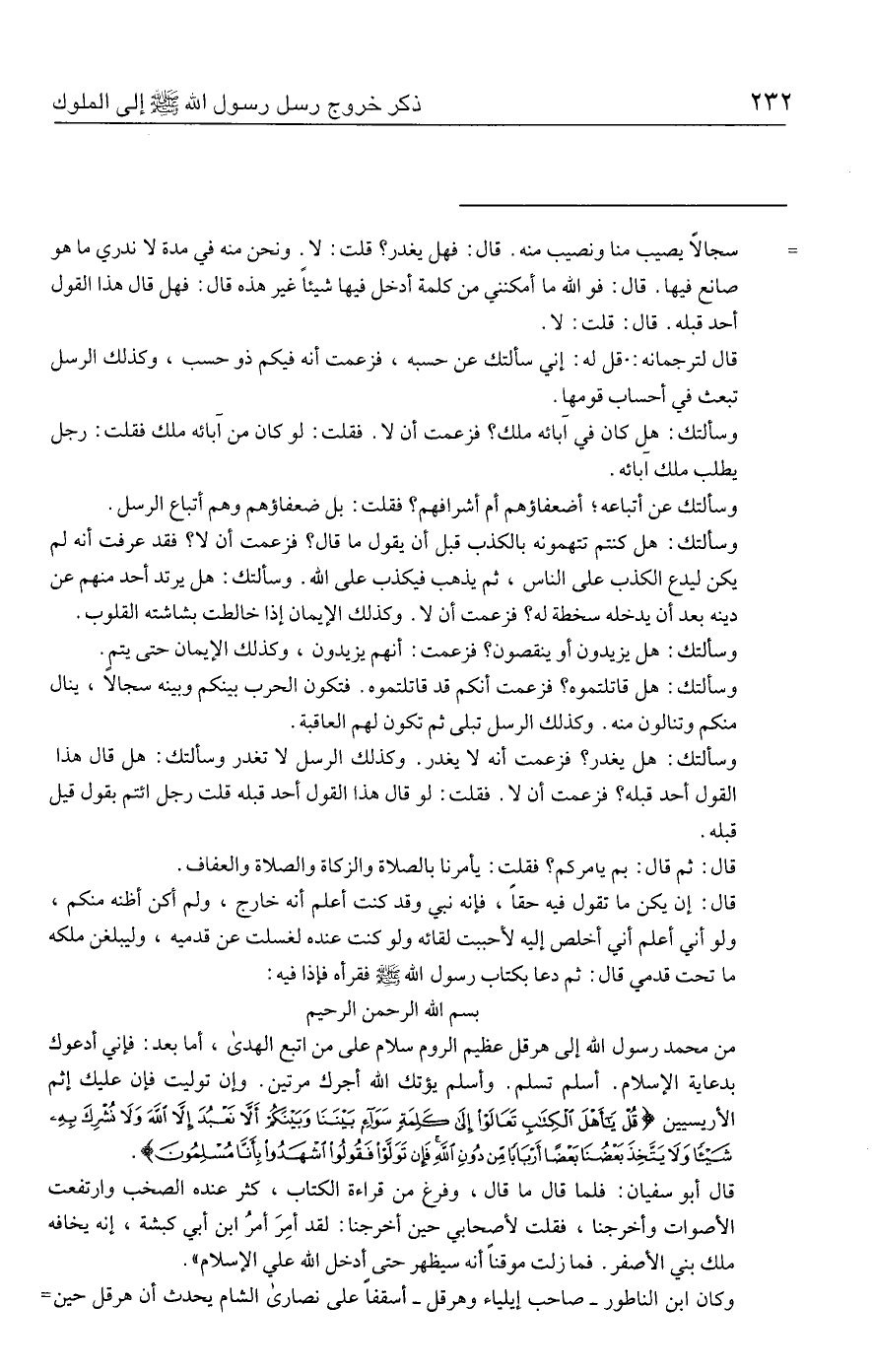 من محمَّد رسول الله إلى هرقل عظيم الروم سلام على من اتبع الهدى، أما بعد: فإني أدعوك بدعاية الإِسلام. أسلم تسلم. وأسلم يؤتك الله أجرك مرتين. وإن توليت فإن عليك إثم الأريسيين {قُلْ يَاأَهْلَ الْكِتَابِ تَعَالوْا إِلَى كَلِمَةٍ سَوَاءٍ بَينَنَا وَبَينَكُمْ أَلَّا نَعْبُدَ إلا اللَّهَ وَلَا نُشْرِكَ بِهِ شَيئًا وَلَا يَتَّخِذَ بَعْضُنَا بَعْضًا أَرْبَابًا مِنْ دُونِ اللَّهِ فَإِنْ تَوَلَّوْا فَقُولُوا اشْهَدُوا بِأَنَّا مُسْلِمُونَ}.