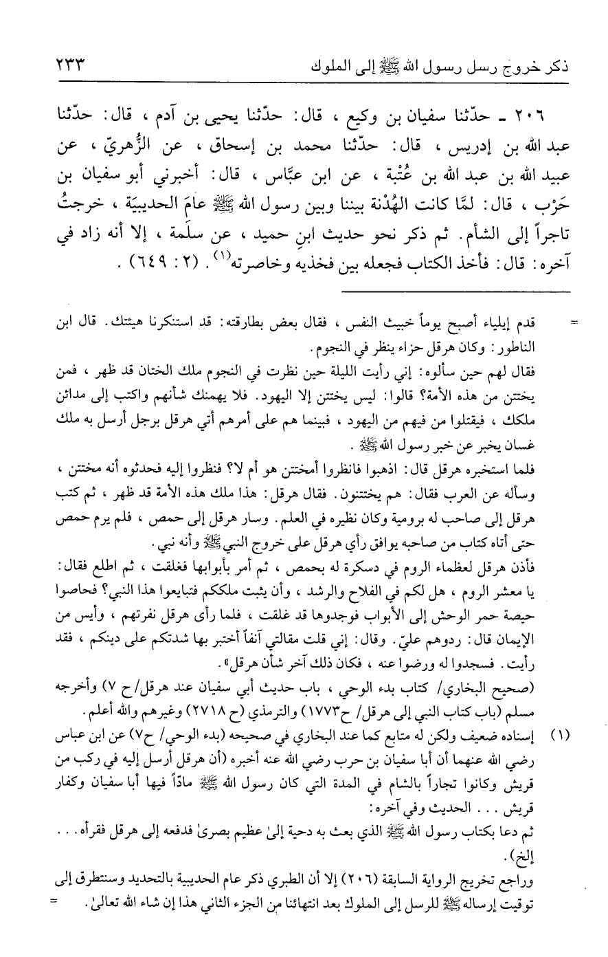 ٢٠٦ - حدَّثنا سفيان بن وكيع، قال: حدَّثنا يحيى بن آدم، قال: حدَّثنا عبد الله بن إدريس، قال: حدَّثنا محمَّد بن إسحاق، عن الزُّهريّ، عن عبيد الله بن عبد الله بن عُتْبة، عن ابن عبَّاس، قال: أخبرني أبو سفيان بن حَرْب، قال: لمَّا كانت الهُدْنة بيننا وبين رسول الله - صلى الله عليه وسلم - عامَ الحديبيَة، خرجتُ تاجرًا إلى الشأم. ثمَّ ذكر نحو حديث ابنِ حميد، عن سلَمة، إلا أنَّه زاد في آخره: قال: فأخذ الكتاب فجعله بين فخذيه وخاصرته (١). (٢: ٦٤٩).