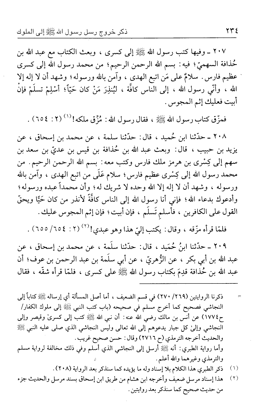 ٢٠٨ - حدَّثنا ابن حُميد، قال: حدَّثنا سلمة، عن محمَّد بن إسحاق، عن يزيد بن حبيب، قال: وبعث عبد الله بن حُذافة بن قيس بن عديّ بن سعد بن سهم إلى كِسْرى بن هرمز ملك فارس وكتب معه: بسم الله الرحمن الرحيم. من محمَّد رسول الله إلى كِسْرى عظيم فارس؛ سلام عَلَى من اتبع الهدى، وآمن بالله ورسوله، وشهد أن لا إله إلا الله وحده لا شريك له؛ وأن محمدًا عبده ورسوله؛ وأدعوك بدعاء الله؛ فإني أنا رسول الله إلى الناس كافَّةً لأنذر من كان حَيًّا ويحقّ القول على الكافرين، فأسلم تَسلَم، فإن أبيت؛ فإن إثم المجوس عليك.