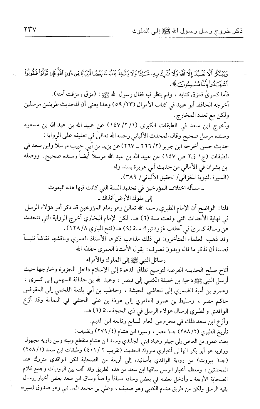 قلنا: الواضح أن الإمام الطبري رحمه الله تعالى وهو إمام المؤرخين قد ذكر أمر هؤلاء الرسل في نهاية الأحداث التي وقعت سنة (٦) هـ. لكن الإمام البخاري أخرج الرواية التي تتحدث عن رسالة كسرى في أعقاب غزوة تبوك سنة (٩) هـ (فتح الباري ٨/ ١٢٨).