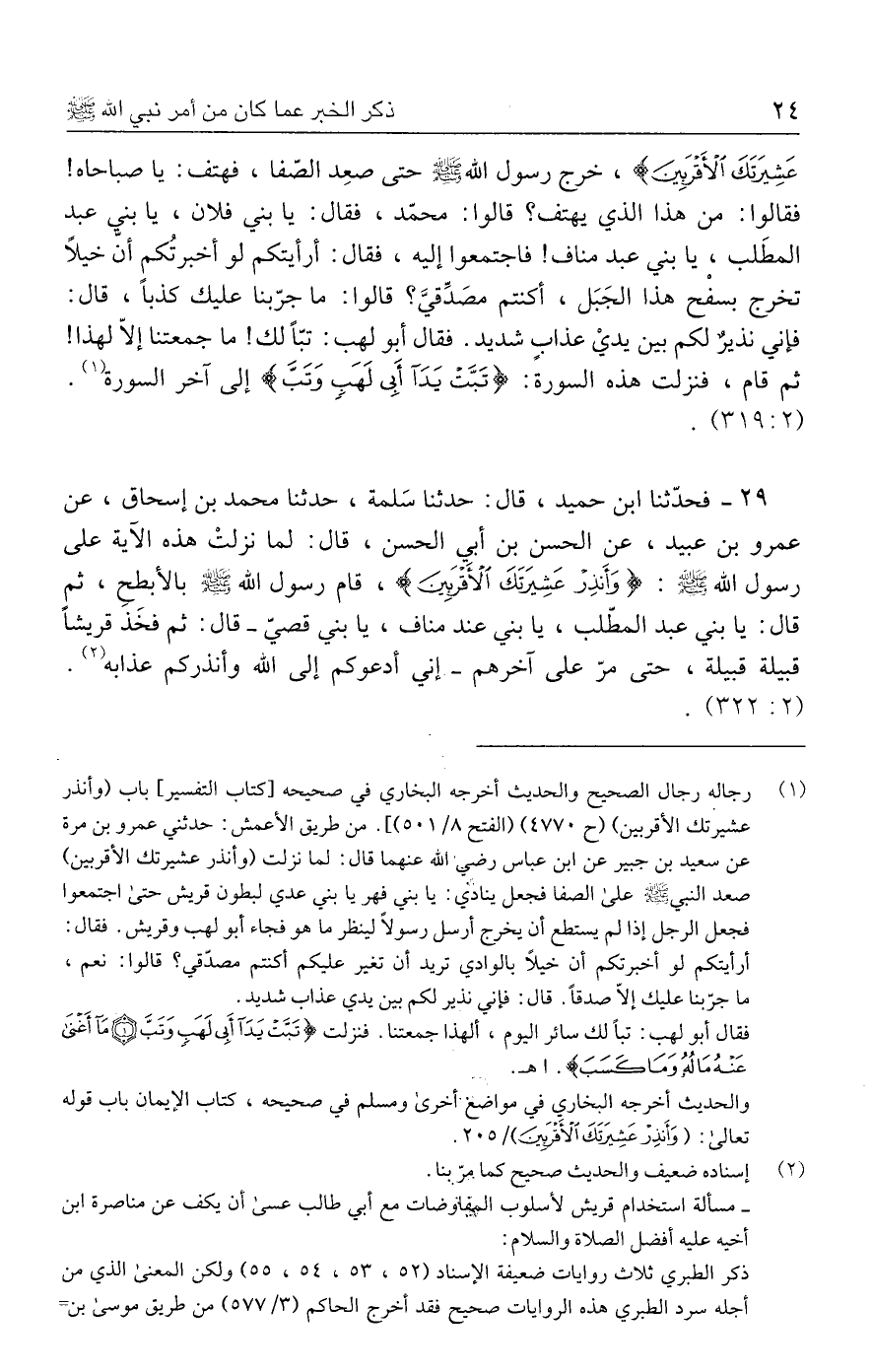 ٢٩ - فحدّثنا ابن حميد، قال: حدثنا سَلمة، حدثنا محمد بن إسحاق، عن عمرو بن عبيد، عن الحسن بن أبي الحسن، قال: لما نزلتْ هذه الآية على رسول الله - صلى الله عليه وسلم -: {وَأَنْذِرْ عَشِيرَتَكَ الْأَقْرَبِينَ}، قام رسول الله - صلى الله عليه وسلم - بالأبطحِ، ثم قال: يا بني عبد المطّلب، يا بني عند مناف، يا بني قصيّ - قال: ثم فخَذ قريشًا قبيلة قبيلة، حتى مرّ على آخرهم - إني أدعوكم إلى الله وأنذركم عذابه (٢). (٣٢٢: ٢).