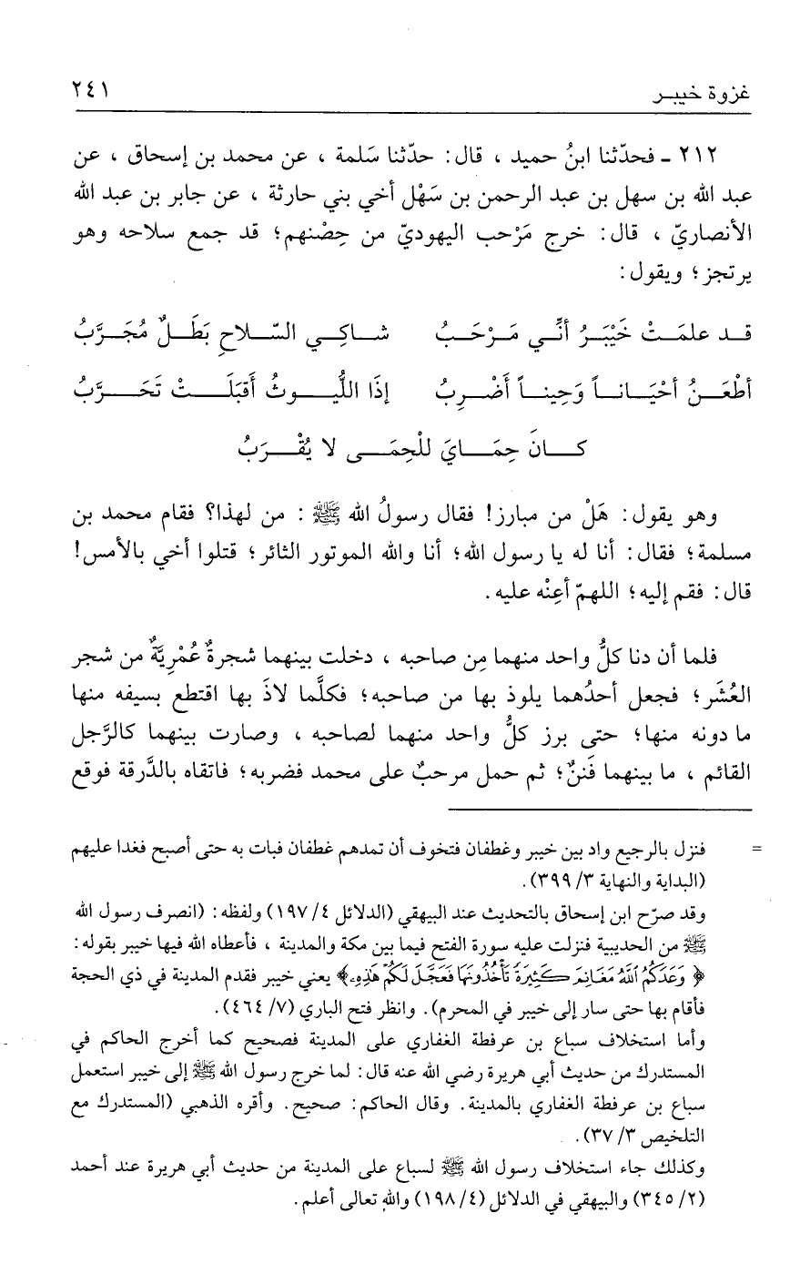 ٢١٢ - فحدّثنا ابنُ حميد، قال: حدَّثنا سَلمة، عن محمَّد بن إسحاق، عن عبد الله بن سهل بن عبد الرحمن بن سَهْل أخي بني حارثة، عن جابر بن عبد الله الأنصاريّ، قال: خرج مَرْحب اليهوديّ من حِصْنهم؛ قد جمع سلاحه وهو يرتجز؛ ويقول:
