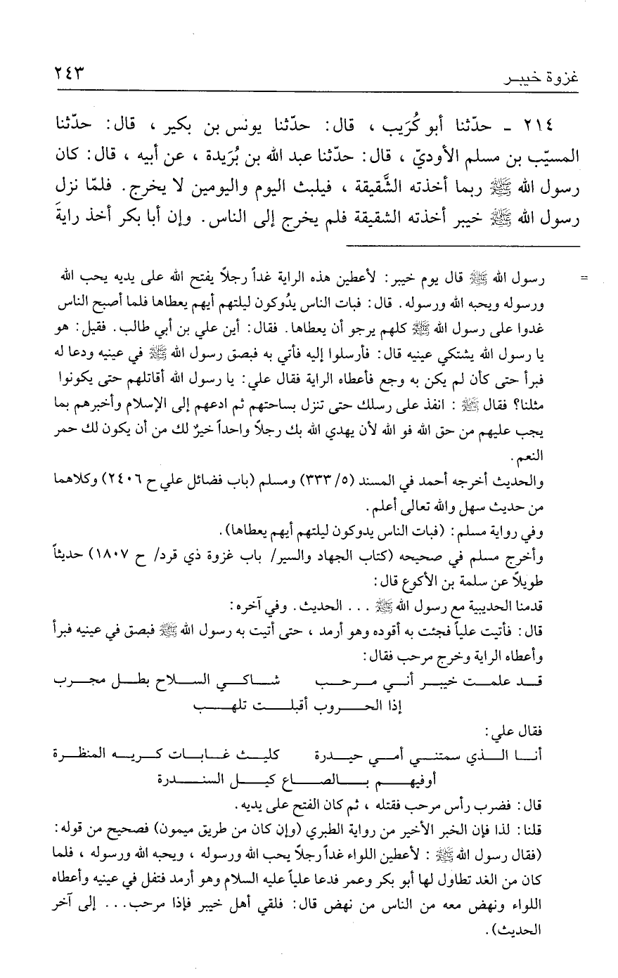 ٢١٤ - حدَّثنا أبو كُرَيب، قال: حدَّثنا يونس بن بكير، قال: حدَّثنا المسيّب بن مسلم الأوديّ، قال: حدَّثنا عبد الله بن بُرَيدة، عن أبيه، قال: كان رسول الله - صلى الله عليه وسلم - ربما أخذته الشَّقيقة، فيلبث اليوم واليومين لا يخرج. فلمّا نزل رسول الله - صلى الله عليه وسلم - خيبر أخذته الشقيقة فلم يخرج إلى الناس. وإن أبا بكر أخذ رايةَ