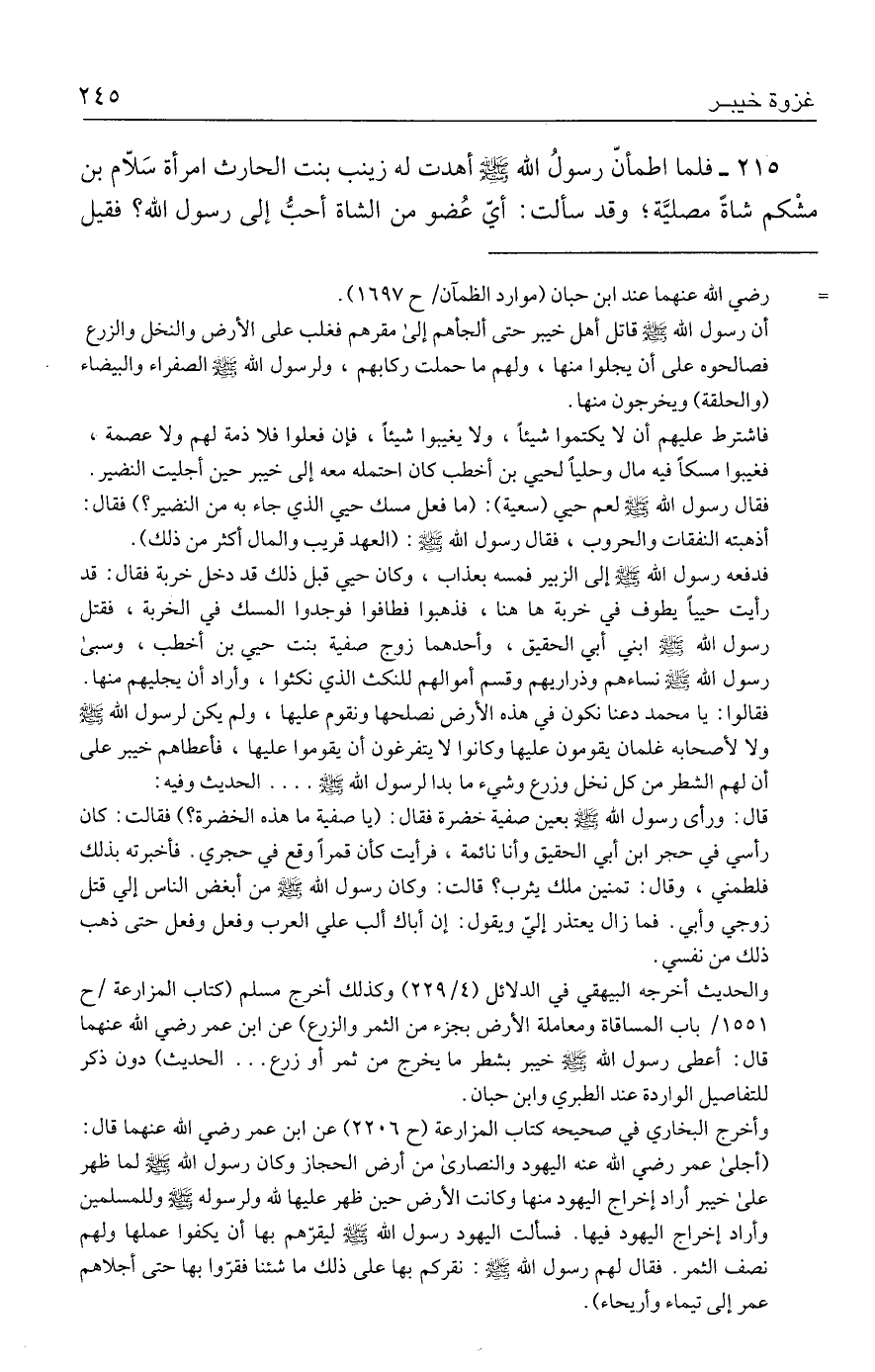 ٢١٥ - فلما اطمأنّ رسولُ الله - صلى الله عليه وسلم - أهدت له زينب بنت الحارث امرأة سَلّام بن مشْكم شاةً مصليَّة؛ وقد سألت: أيّ عُضو من الشاة أحبُّ إلى رسول الله؟ فقيل