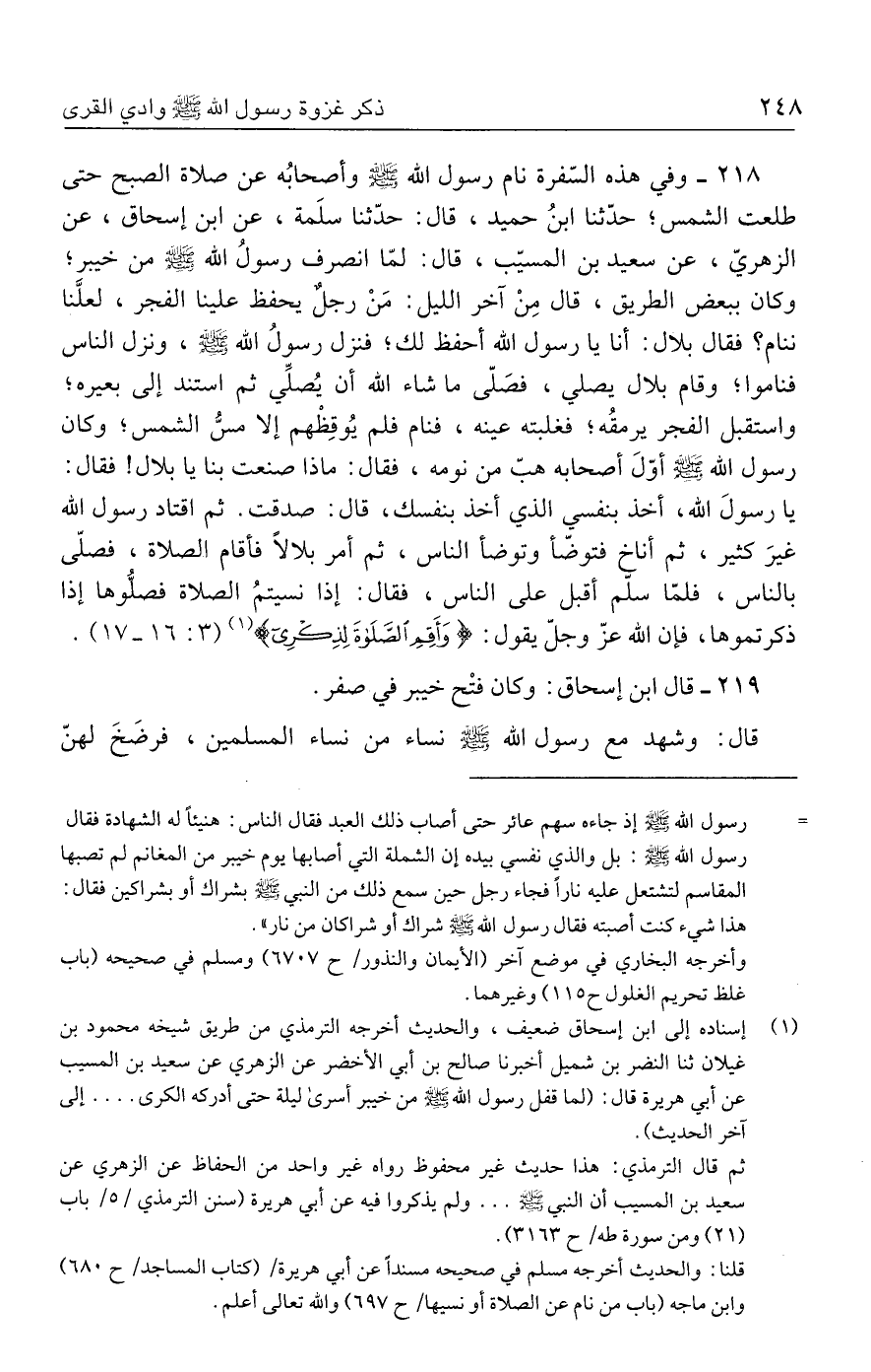٢١٨ - وفي هذه السّفرة نام رسول الله - صلى الله عليه وسلم - وأصحابُه عن صلاة الصبح حتى طلعت الشمس؛ حدَّثنا ابنُ حميد، قال: حدَّثنا سلَمة، عن ابن إسحاق، عن الزهريّ، عن سعيد بن المسيّب، قال: لمّا انصرف رسولُ الله - صلى الله عليه وسلم - من خيبر؛ وكان ببعض الطريق، قال مِنْ آخر الليل: مَنْ رجلٌ يحفظ علينا الفجر، لعلَّنا ننام؟ فقال بلال: أنا يا رسول الله أحفظ لك؛ فنزل رسولُ الله - صلى الله عليه وسلم -، ونزل الناس فناموا؛ وقام بلال يصلي، فصَلّى ما شاء الله أن يُصلِّي ثمَّ استند إلى بعيره؛ واستقبل الفجر يرمقُه؛ فغلبته عينه، فنام فلم يُوقِظْهم إلا مسُّ الشمس؛ وكان رسول الله - صلى الله عليه وسلم - أوّلَ أصحابه هبّ من نومه، فقال: ماذا صنعت بنا يا بلال! فقال: يا رسولَ الله، أخذ بنفسي الذي أخذ بنفسك، قال: صدقت. ثمَّ اقتاد رسول الله غيرَ كثير، ثمَّ أناخ فتوضّأ وتوضأ الناس، ثمَّ أمر بلالًا فأقام الصلاة، فصلّى بالناس، فلمّا سلّم أقبل على الناس، فقال: إذا نسيتمُ الصلاة فصلُّوها إذا ذكرتموها، فإن الله عَزَّ وَجَلَّ يقول: {وَأَقِمِ الصَّلَاةَ لِذِكْرِي} (١) (٣: ١٦ - ١٧).