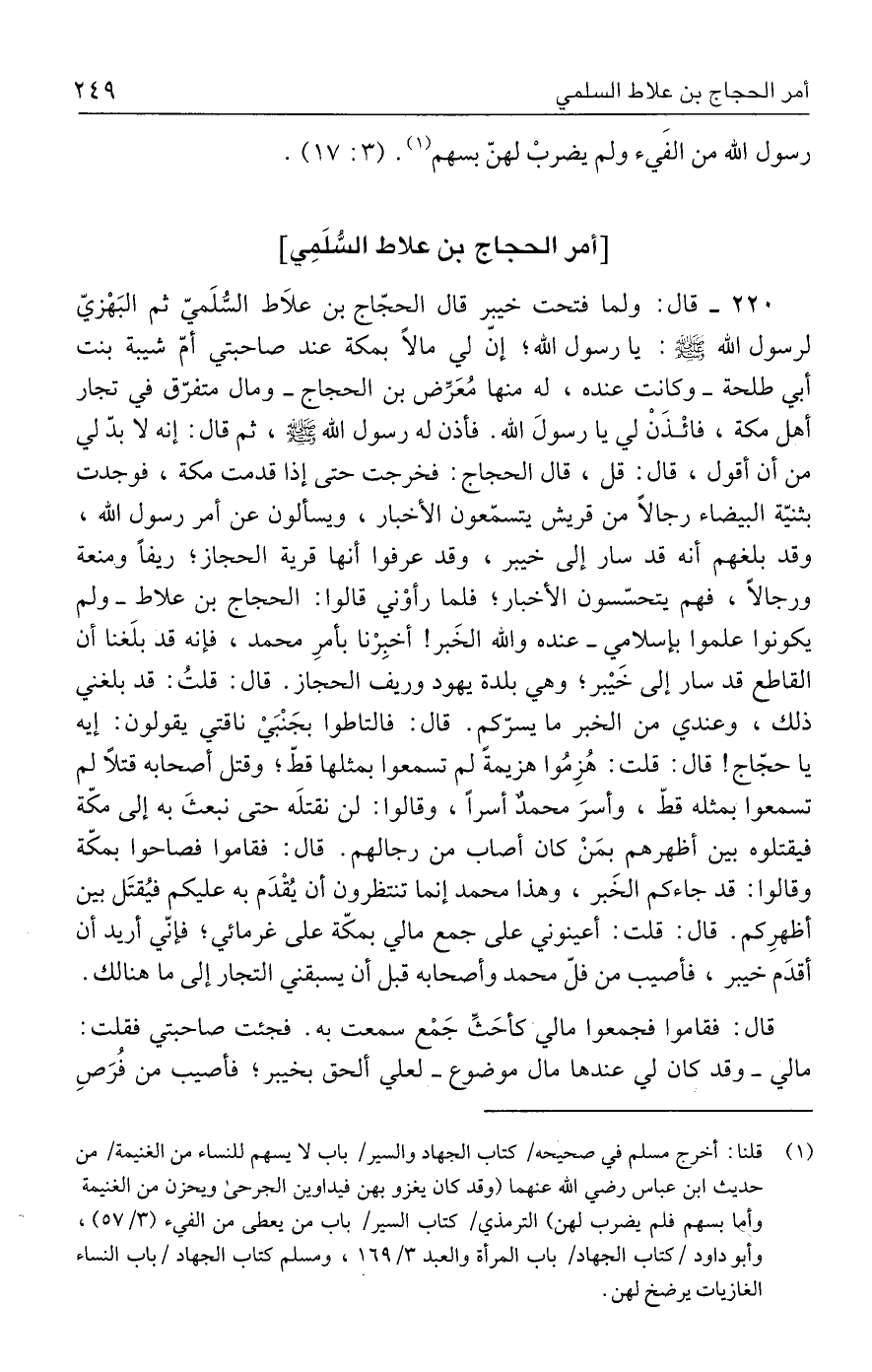 ٢٢٠ - قال: ولما فتحت خيبر قال الحجّاج بن علاط السُّلَميّ ثمَّ البَهْزيّ لرسول الله - صلى الله عليه وسلم -: يا رسول الله؛ إنَّ لي مالًا بمكة عند صاحبتي أمّ شيبة بنت أبي طلحة - وكانت عنده، له منها مُعَرِّض بن الحجاج - ومال متفرّق في تجار أهل مكة، فائْذَنْ لي يا رسولَ الله. فأذن له رسول الله - صلى الله عليه وسلم -، ثمَّ قال: إنه لابدّ لي من أن أقول، قال: قل، قال الحجاج: فخرجت حتى إذا قدمت مكة، فوجدت بثنيّة البيضاء رجالًا من قريش يتسمّعون الأخبار، ويسألون عن أمر رسول الله، وقد بلغهم أنَّه قد سار إلى خيبر، وقد عرفوا أنها قرية الحجاز؛ ريفًا ومنعة ورجالًا، فهم يتحسّسون الأخبار؛ فلما رأوْني قالوا: الحجاج بن علاط - ولم يكونوا علموا بإسلامي - عنده والله الخَبر! أخبِرْنا بأمرِ محمَّد، فإنَّه قد بلَغنا أن القاطع قد سار إلى خَيبر؛ وهي بلدة يهود وريف الحجاز. قال: قلتُ: قد بلغني ذلك، وعندي من الخبر ما يسرّكم. قال: فالتاطوا بجَنْبَي ناقتي يقولون: إيه يا حجّاج! قال: قلت: هُزِمُوا هزيمةً لم تسمعوا بمثلها قطّ؛ وقتل أصحابه قتلًا لم تسمعوا بمثله قطّ، وأسرَ محمدٌ أسرًا، وقالوا: لن نقتلَه حتى نبعثَ به إلى مكّة فيقتلوه بين أظهرهم بمَنْ كان أصاب من رجالهم. قال: فقاموا فصاحوا بمكّة وقالوا: قد جاءكم الخَبر، وهذا محمَّد إنما تنتظرون أن يُقْدَم به عليكم فيُقتَل بين أظهرِكم. قال: قلت: أعينوني على جمع مالي بمكّة على غرمائي؛ فإنّي أريد أن أقدَم خيبر، فأصيب من فلّ محمَّد وأصحابه قبل أن يسبقني التجار إلى ما هنالك.
