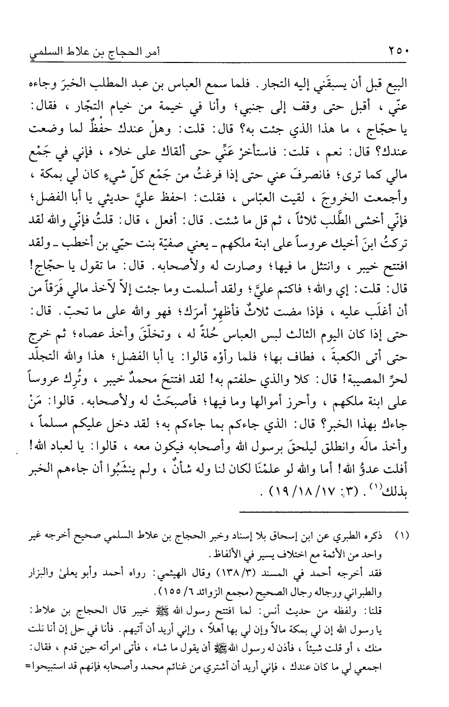 البيع قبل أن يسبقَني إليه التجار. فلما سمع العباس بن عبد المطلب الخبرَ وجاءه عنّي، أقبل حتى وقف إلى جنبي؛ وأنا في خيمة من خيام التجّار، فقال: يا حجّاج، ما هذا الذي جئت به؟ قال: قلت: وهلْ عندك حفْظٌ لما وضعت عندك؟ قال: نعم، قلت: فاستأخرْ عَنِّي حتى ألقاك على خلاء، فإني في جَمْع مالي كما ترى؛ فانصرفَ عني حتى إذا فرغتُ من جَمْع كلّ شيءٍ كان لي بمكة، وأجمعت الخروجَ، لقيت العبّاس، فقلت: احفظ عليَّ حديثي يا أبا الفضل؛ فإنّي أخشى الطَّلب ثلاثًا، ثمَّ قل ما شئت. قال: أفعل، قال: قلتُ فإنّي والله لقد تركتُ ابنَ أخيك عروسًا على ابنة ملكهم -يعني صفيّة بنت حيّي بن أخطب- ولقد افتتح خيبر، وانتثل ما فيها؛ وصارت له ولأصحابه. قال: ما تقول يا حجّاج! قال: قلت: إي والله؛ فاكتم عليَّ؛ ولقد أسلمت وما جئت إلَّا لآخذ مالي فَرَقًا من أن أغلَب عليه، فإذا مضت ثلاثٌ فأظهِرْ أمرَك؛ فهو والله على ما تحبّ. قال: حتى إذا كان اليوم الثالث لبس العباس حُلةً له، وتخلّقَ وأخذ عصاه؛ ثمَّ خرج حتى أتى الكعبةَ، فطاف بها؛ فلما رأوْه قالوا: يا أبا الفضل؛ هذا والله التجلّد لحرِّ المصيبة! قال: كلا والذي حلفتم به! لقد افتتحَ محمدٌ خيبر، وتُرِك عروسًا على ابنة ملكهم، وأحرز أموالها وما فيها؛ فأصبحَتْ له ولأصحابه. قالوا: مَنْ جاءك بهذا الخبر؟ قال: الذي جاءكم بما جاءكم به؛ لقد دخل عليكم مسلمًا، وأخذ ماله وانطلق ليلحقَ برسول الله وأصحابه فيكون معه، قالوا: يا لعباد الله! أفلت عدوُّ الله! أما والله لو علمْنَا لكان لنا وله شأنٌ، ولم ينشَبُوا أن جاءهم الخبر بذلك (١). (٣: ١٧/ ١٨ / ١٩).