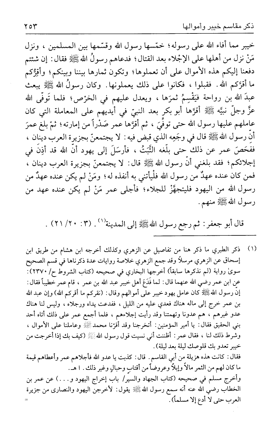 خيبر مما أفاء الله علي رسوله؛ خمّسها رسول الله وقسّمها بين المسلمين، ونزل مَنْ نزل من أهلها علي الإجْلاء بعد القتال؛ فدعاهم رسولُ الله - صلى الله عليه وسلم - فقال: إن شئتم دفعنا إليكم هذه الأموال علي أن تعملوها؛ وتكون ثمارها بيننا وبينكم؛ وأقِرُّكم ما أقرَّكم الله. فقبلوا، فكانوا علي ذلك يعملونها. وكان رسولُ الله - صلى الله عليه وسلم - يبعث عبدَ الله بن رواحة فيَقْسِمُ ثمرَها، ويعدل عليهم في الخرْص؛ فلما تَوفّي الله عزَّ وجلّ نبيَّه - صلى الله عليه وسلم - أقرَّها أبو بكرِ بعد النبيّ في أيديهم علي المعاملة التي كان عاملهم عليها رسول الله حتى توفِّيَ، ثم أقرَّها عمر صَدْرًا من إمارته؛ ثمّ بلغ عمرَ أنِّ رسول الله - صلى الله عليه وسلم - قال في وجَعِه الذي قبض فيه: لا يجتمعنّ بجزيرة العرب دينان، ففحَصَ عمر عن ذلك حتى بلّغه الثَّبَتُ، فأرسَلَ إلي يهود أنّ الله قد أذِنَ في إجلائكم؛ فقد بلغني أنّ رسول الله - صلى الله عليه وسلم - قال: لا يجتمعنّ بجزيرة العرب دينان، فمن كان عنده عها من رسول الله فلْيأتني به أنفذه له؛ ومَنْ لم يكن عنده عهدٌ من رسول الله من اليهود فليتجهَّزْ للجلاء، فأجلي عمر مَنْ لم يكن عنده عهد من رسول الله - صلى الله عليه وسلم - منهم.