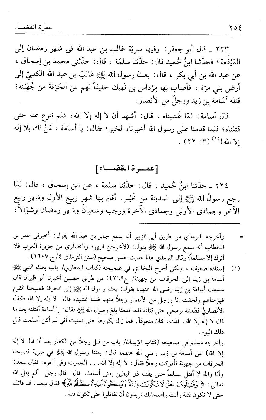 ٢٢٣ - قال أبو جعفر: وفيها سريّة غالب بن عبد الله في شهر رمضان إلي المَيفَعة؛ فحدّثنا ابنُ حُميد قال: حدَّثنا سلمَة، قال: حدّثني محمد بن إسحاق، عن عبد الله بن أبي بكر، قال: بعثَ رسول الله - صلى الله عليه وسلم - غالبَ بن عبد الله الكلبيّ إلي أرض بني مرّة، فأصاب بها مِرْداس بن نَهيك حليفًا لهم من الحُرَقة من جُهَينة؛ قتله أسَامة بن زيد ورجلٌ من الأنصار.