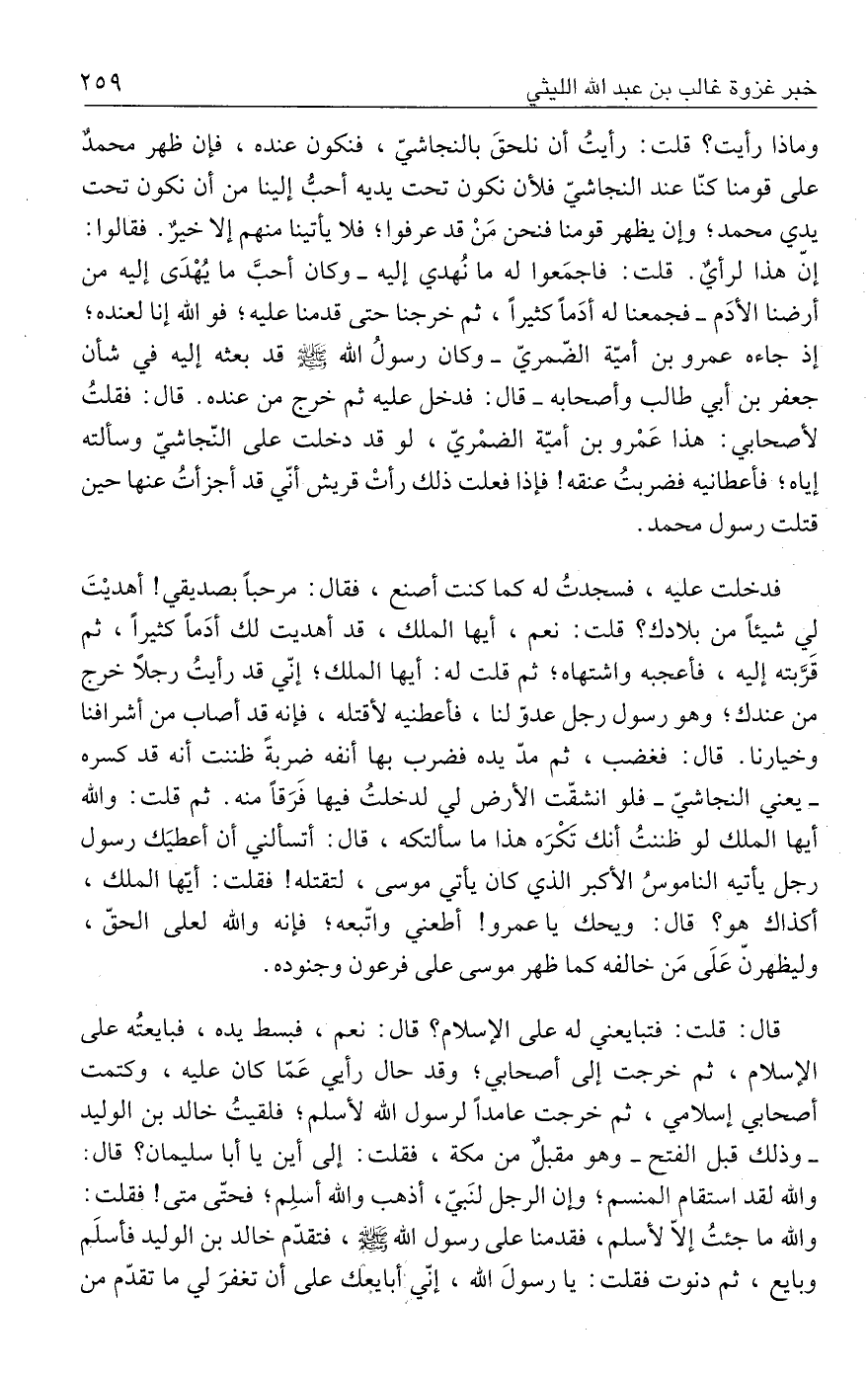 فدخلت عليه، فسجدتُ له كما كنت أصنع، فقال: مرحبًا بصديقي! أهديتَ لي شيئًا من بلادك؟ قلت: نعم، أيها الملك، قد أهديت لك أدَمًا كثيرًا، ثم قَرَّبته إليه، فأعجبه واشتهاه؛ ثم قلت له: أيها الملك؛ إنّي قد رأيتُ رجلًا خرج من عندك؛ وهو رسول رجل عدوّ لنا، فأعطنيه لأقتله، فإنه قد أصاب من أشرافنا وخيارنا. قال: فغضب، ثم مدّ يده فضرب بها أنفه ضربةً ظننت أنه قد كسره -يعني النجاشيّ- فلو انشقّت الأرض لي لدخلتُ فيها فَرَقًا منه. ثم قلت: والله أيها الملك لو ظننتُ أنك تَكْرَه هذا ما سألتكه، قال: أتسألني أن أعطيَك رسول رجل يأتيه الناموسُ الأكبر الذي كان يأتي موسى، لتقتله! فقلت: أيّها الملك، أكذاك هو؟ قال: ويحك يا عمرو! أطعني واتّبعه؛ فإنه والله لعلي الحقّ، وليظهرنّ عَلَى مَن خالفه كما ظهر موسى علي فرعون وجنوده.
