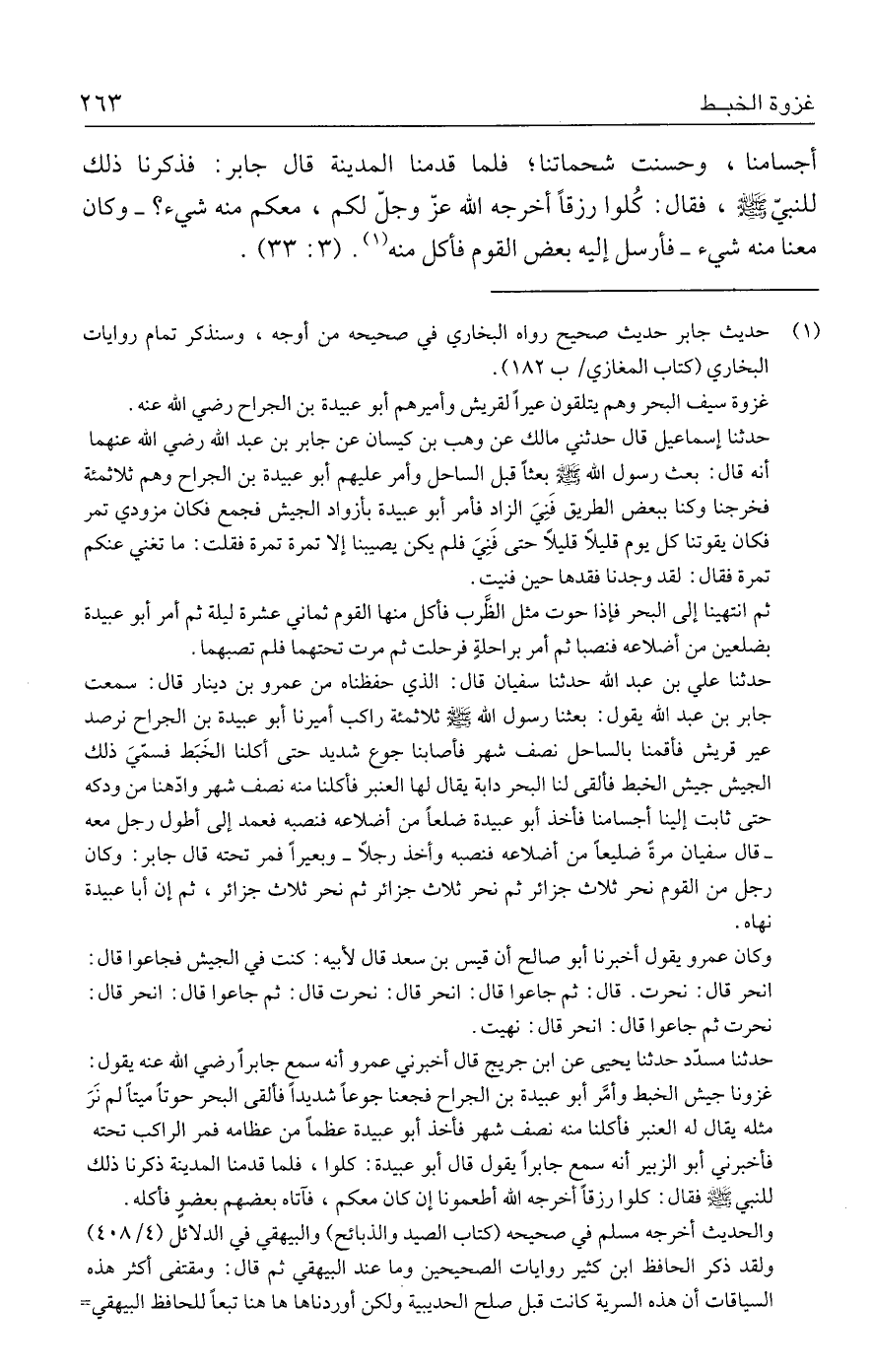 حدثنا علي بن عبد الله حدثنا سفيان قال: الذي حفظناه من عمرو بن دينار قال: سمعت جابر بن عبد الله يقول: بعثنا رسول الله - صلى الله عليه وسلم - ثلاثمئة راكب أميرنا أبو عبيدة بن الجراح نرصد عير قريش فأقمنا بالساحل نصف شهر فأصابنا جوع شديد حتى أكلنا الخَبَط فسمّيَ ذلك الجيش جيش الخبط فألقي لنا البحر دابة يقال لها العنبر فأكلنا منه نصف شهر وادّهنا من ودكه حتى ثابت إلينا أجسامنا فأخذ أبو عبيدة ضلعًا من أضلاعه فنصبه فعمد إلي أطول رجل معه - قال سفيان مرةً ضليعًا من أضلاعه فنصبه وأخذ رجلًا - وبعيرًا فمر تحته قال جابر: وكان رجل من القوم نحر ثلاث جزائر ثم نحر ثلاث جزائر ثم نحر ثلاث جزائر، ثم إن أبا عبيدة نهاه.