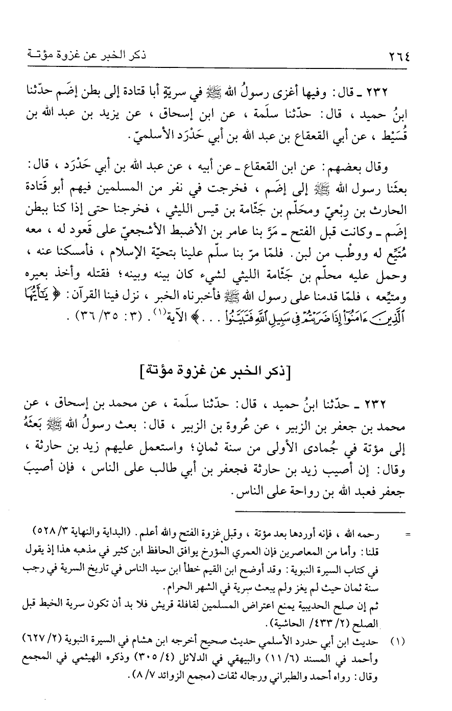 ٢٣٢ - حدَّثنا ابنُ حميد، قال: حدَّثنا سلَمة، عن محمد بن إسحاق، عن محمد بن جعفر بن الزبير، عن عُروة بن الزبير، قال: بعث رسولُ الله - صلى الله عليه وسلم - بَعثَهُ إلى مؤتة في جُمادي الأولى من سنة ثمانٍ؛ واستعمل عليهم زيد بن حارثة، وقال: إن أصيب زيد بن حارثة فجعفر بن أبي طالب علي الناس، فإن أصيبَ جعفر فعبد الله بن رواحة علي الناس.