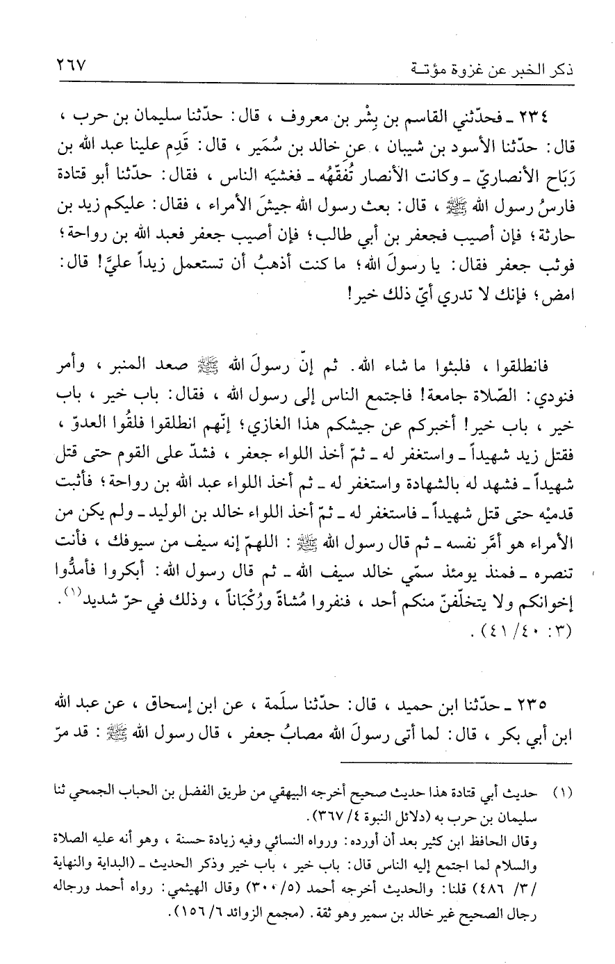 ٢٣٥ - حدَّثنا ابن حميد، قال: حدَّثنا سلَمة، عن ابن إسحاق، عن عبد الله بن أبي بكر، قال: لما أتي رسولَ الله مصابُ جعفر، قال رسول الله - صلى الله عليه وسلم -: قد مرّ